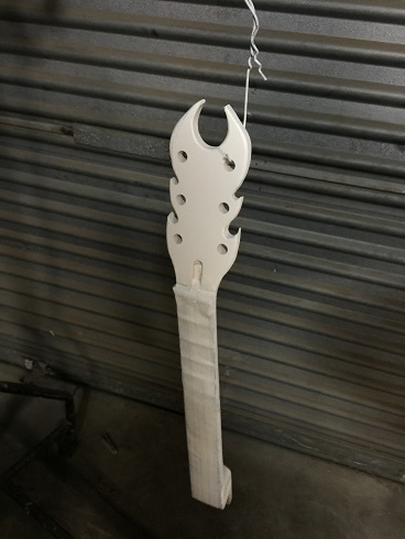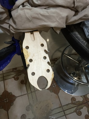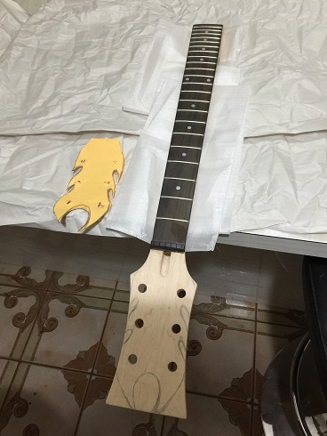 Next was the headstock. Thought I would design the headstock first before I sealed the wood. Thought a fiery devil horny type look would fit the SG pointed style best.