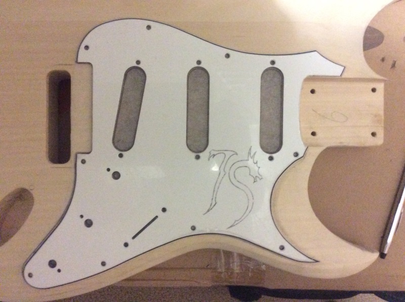 I'll shape the pickguard. So far its looking like this. I think it needs a bit more work and I'm still thinking about the logo. This ones a bit big. Attachment 16807