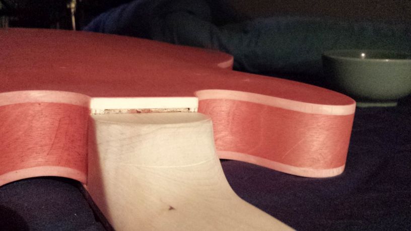 Hey John, might be worth trying to get a white filler in that area between the neck heel and the body binding, looks a bit messy as it is. Might blend in better if you try and match the binding colour, or another option is to get matching binding, cut into small pieces and put in a bowl of acetone and it breaks down to a liquid and use that to fill it