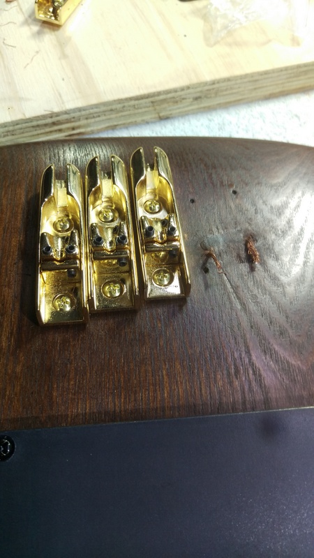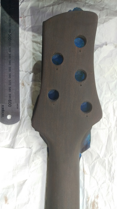 The kit came pre-drilled for headstock and bridge and they must have had their template wrong for the headstock... The side with 3x is okay, but the one with 2x looks very weird. I'll have to fill this one (with a toothpick maybe?) and re-drill: