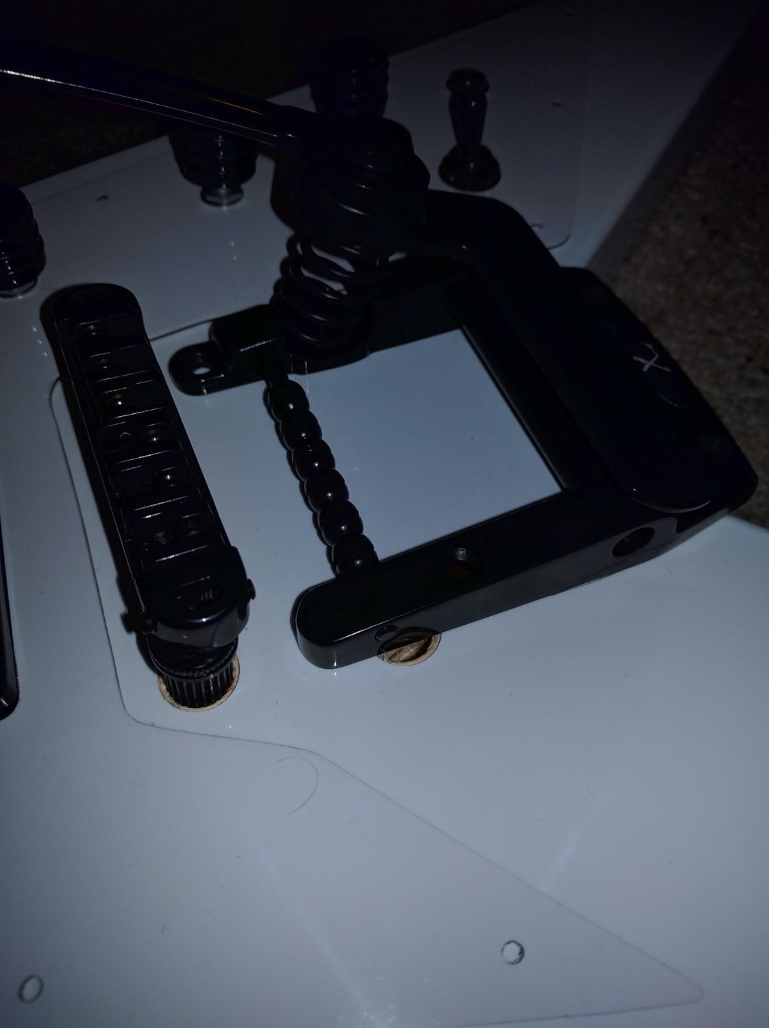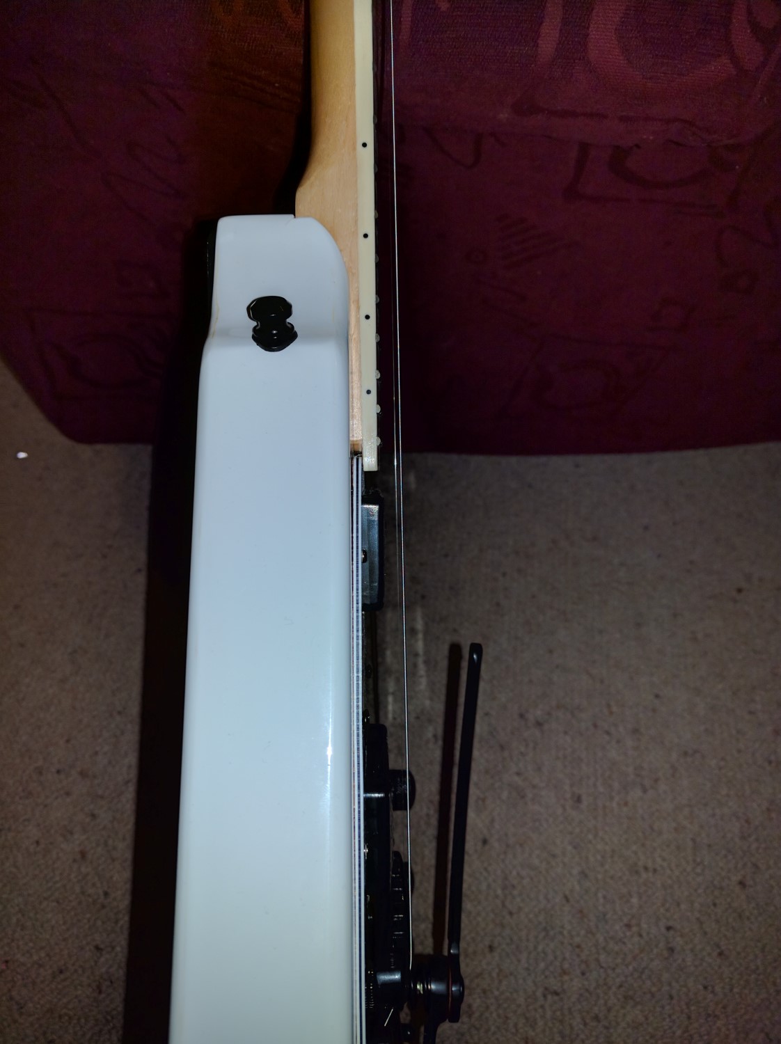 On top of that, All black hardware, White Pearl pickguard (which I'm going to cut myself so that I can use different controls). Also considering organising a Strat-style input jack on the front, but that would be a good chunk of work and I'm not sold on it in my head just yet.