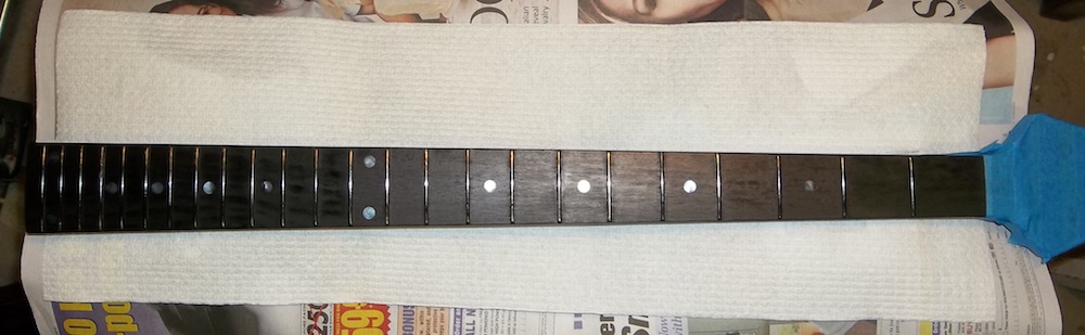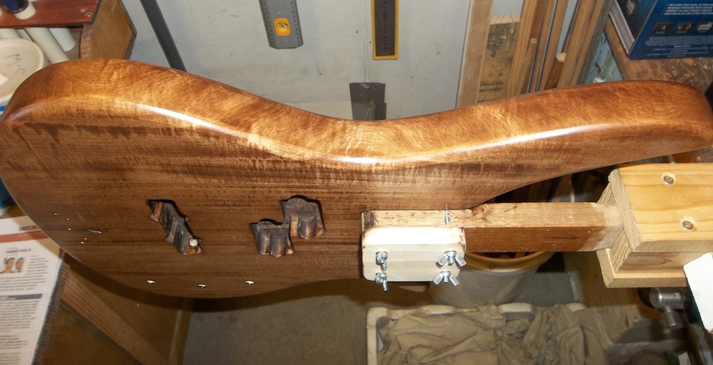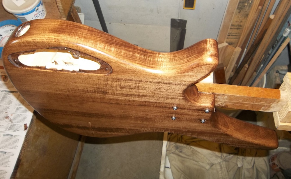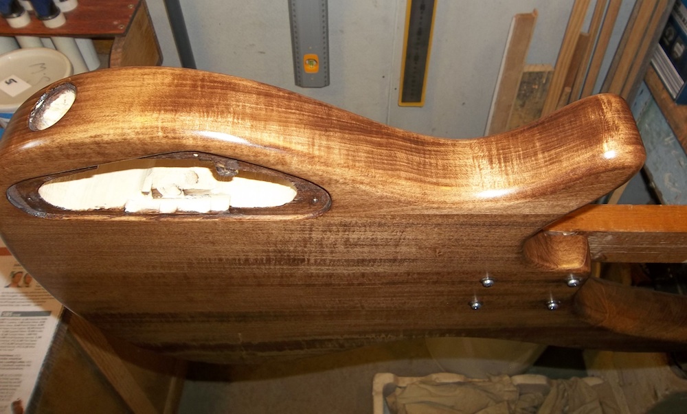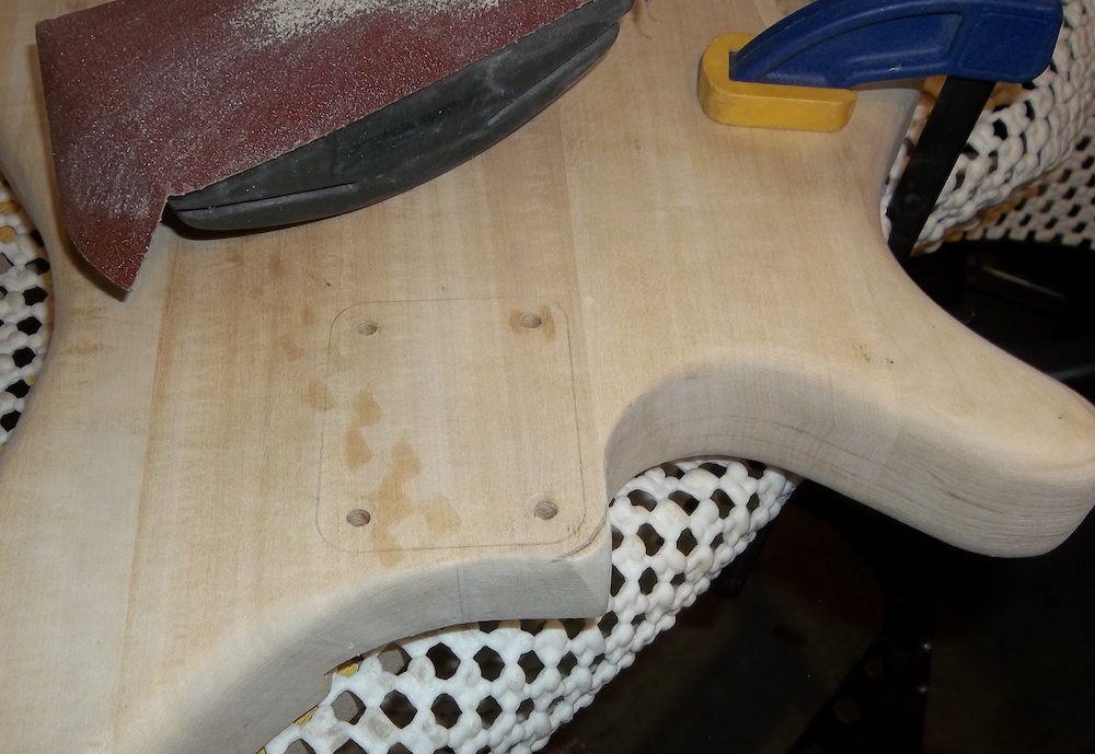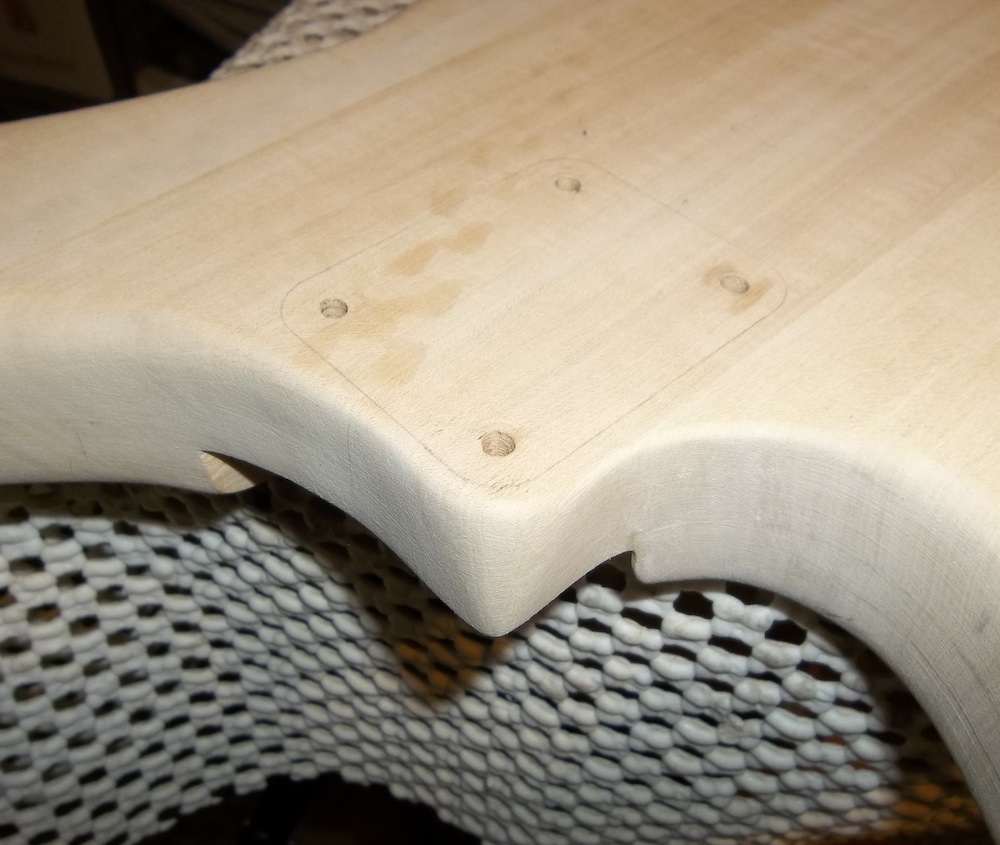 The main focus of this build is the wiring, so getting the basis for that sorted is the first priority. What I had in mind would require at least 4 switches, one of which needed to be a slide switch, and that meant they would all have to be slide switches. Where to put them? I wan't sure if the wiring would work the way I wanted or if I'd keep it in the long-term, so I didn't want any holes on the face of the body. I could try to put them on the upper edge of the body, but again, if I ever removed them it would leave holes. So, that only left one option… try to squeeze everything into the rather small control cavity at the back. I didn't intend the switches to be changed on the fly, so mounting them on the back will work as long as I can get everything to fit.