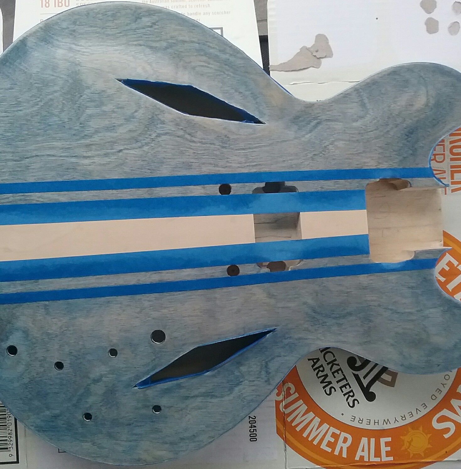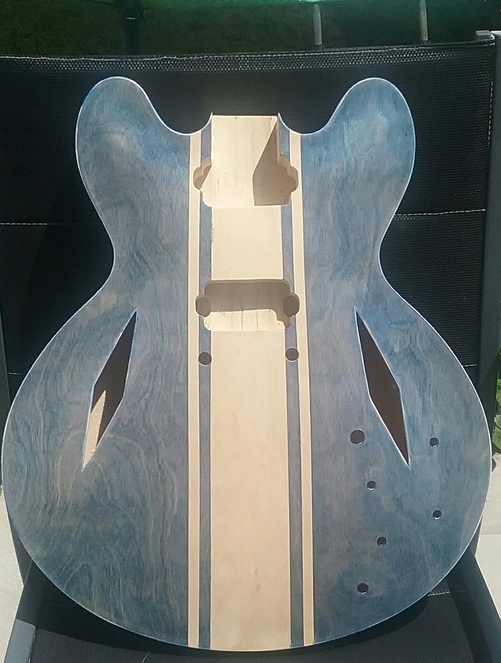 Just received my ES1TL kit. I've been comparing it to my epiphone 333 and you would swear they came out of the same factory. Icant believe how good the body and neck are, the Dave grohl diamond cut outs look awsome i hope i can get the finish right and do it justice. Hoping to do dingotone bondi blue on the top with a racing strip in natural and the back sides and neck all natural,it is my first go at building a kit so it should be interesting, super stoked about how good the kit is. Any tips on how to get the blue stain right would be greatly appreciated