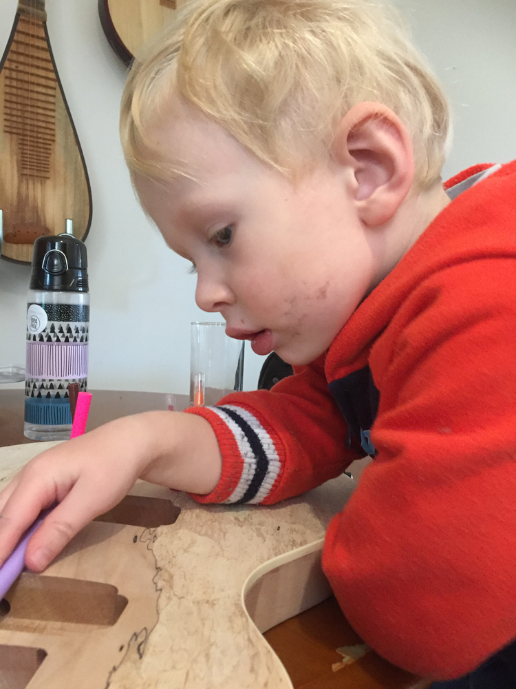 Mondays are my day at home with the kids, so while the littlest was asleep the little man and I got some more done on the guitar.