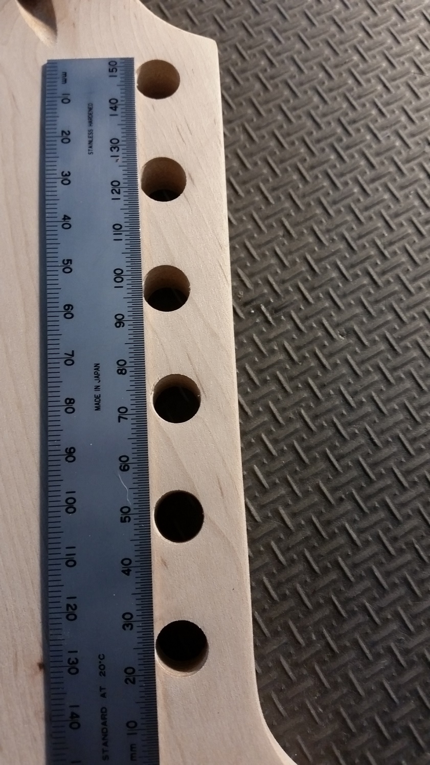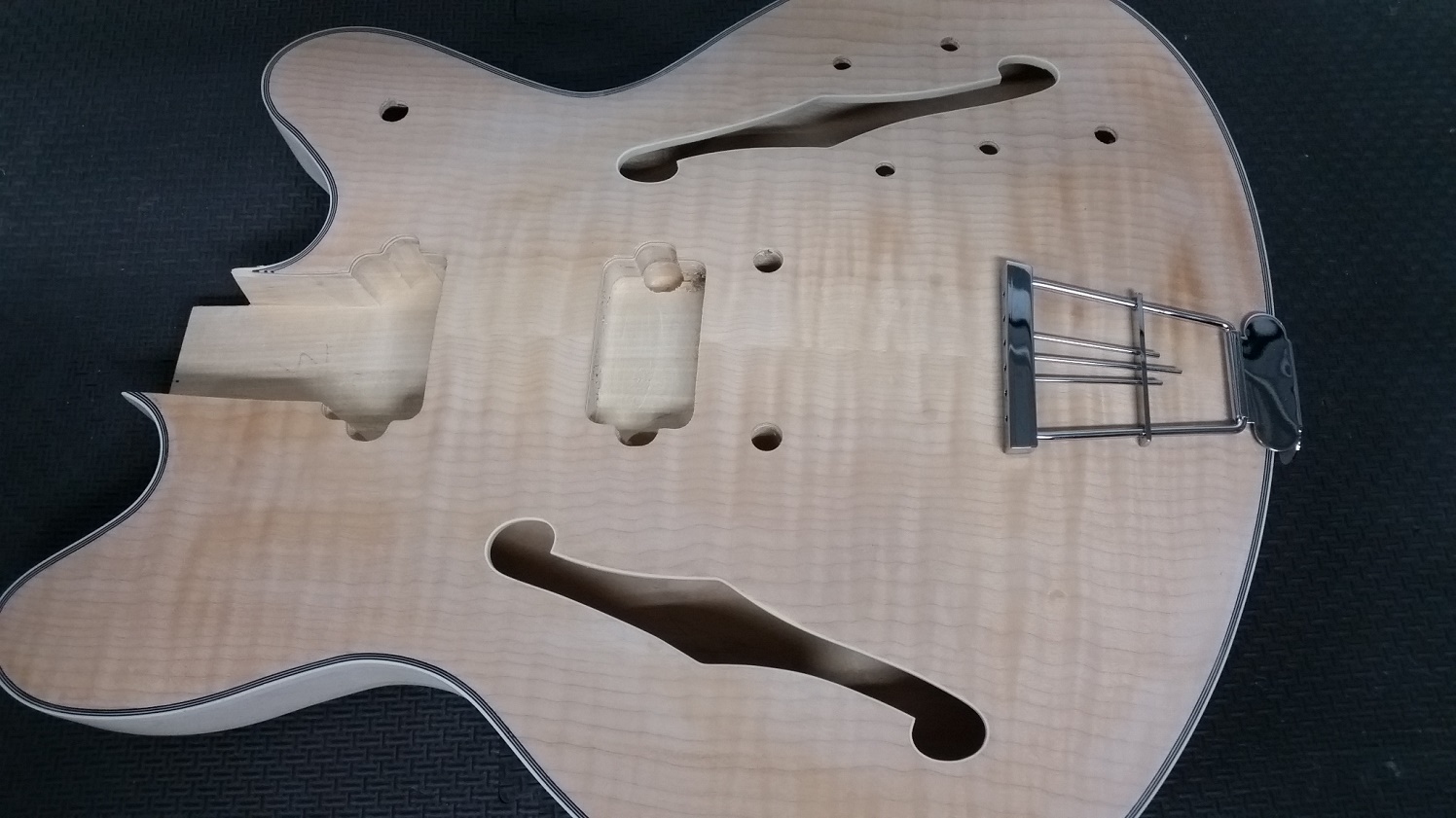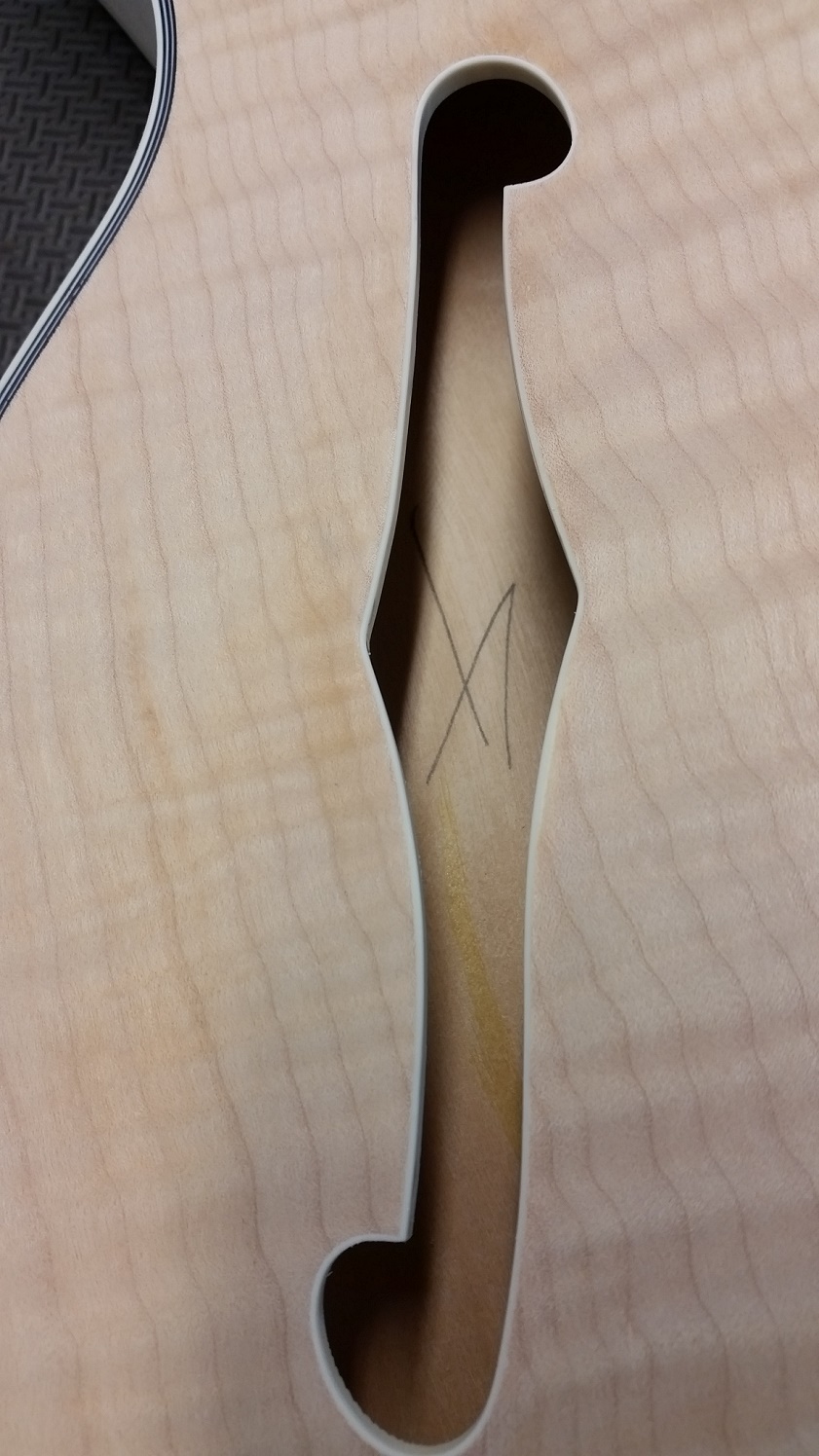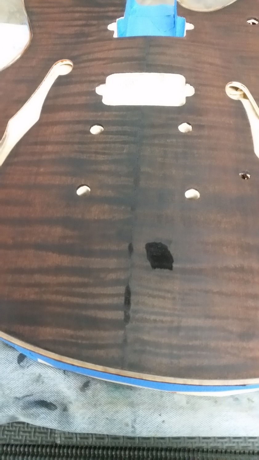 Flame top is really nice and have only found a couple of small glue spots. Speaking of glue, unfortunately some has run along the back of the body inside the bass side f-hole. Haven't tried to remove it yet, just hope it hasn't stained the timber too much. Still scratching my head as to why someone at the factory would put a pencil thru both f-holes and mark (sign?) the back of the body.