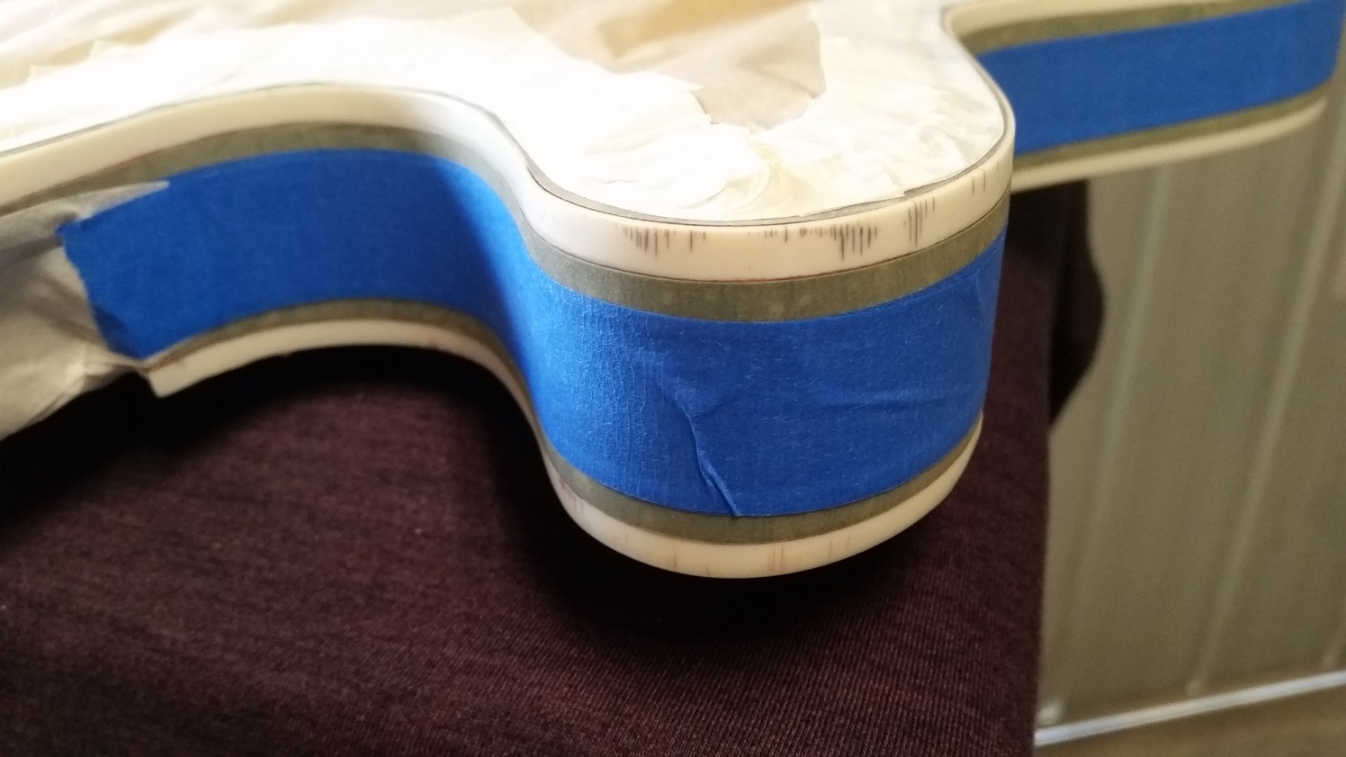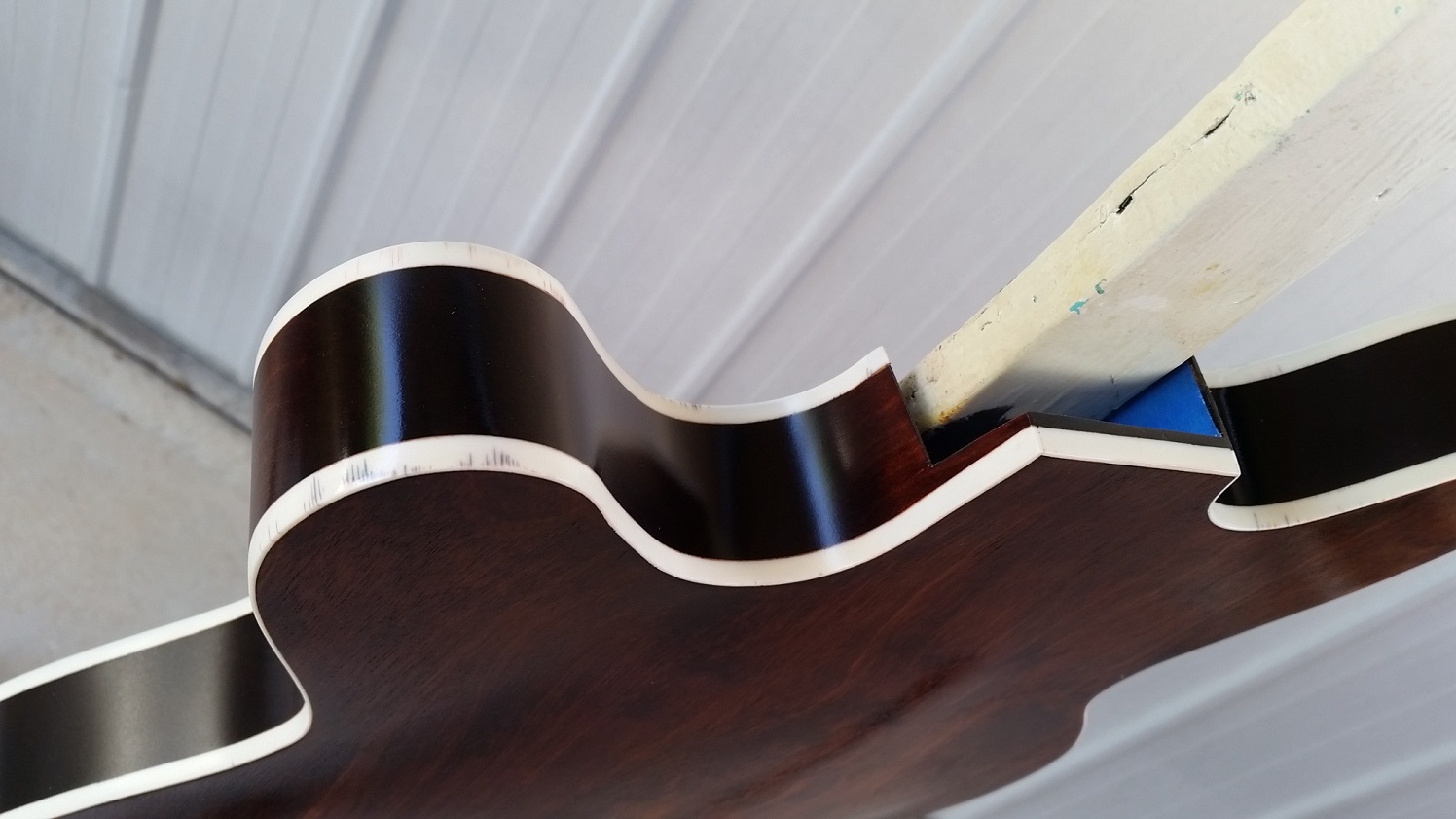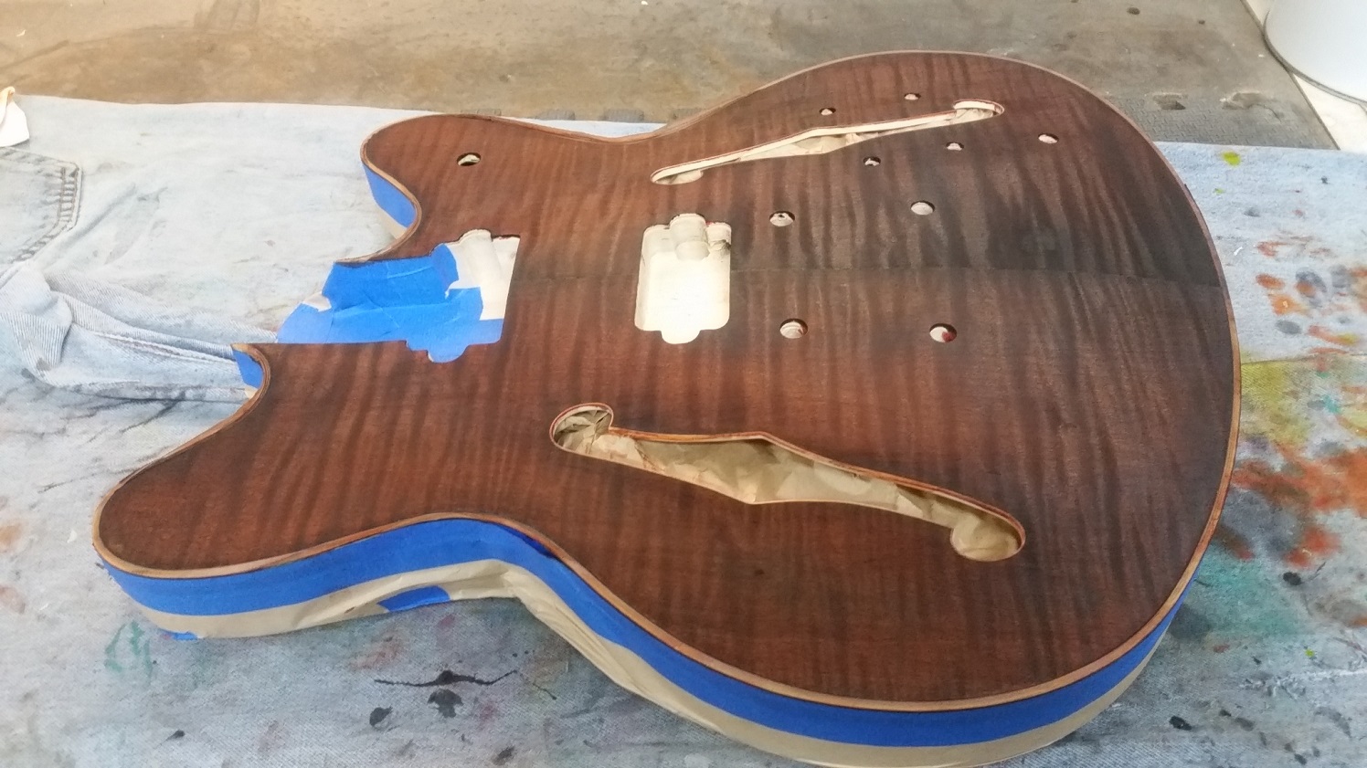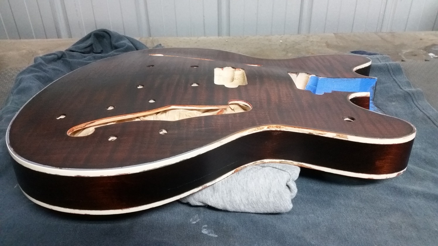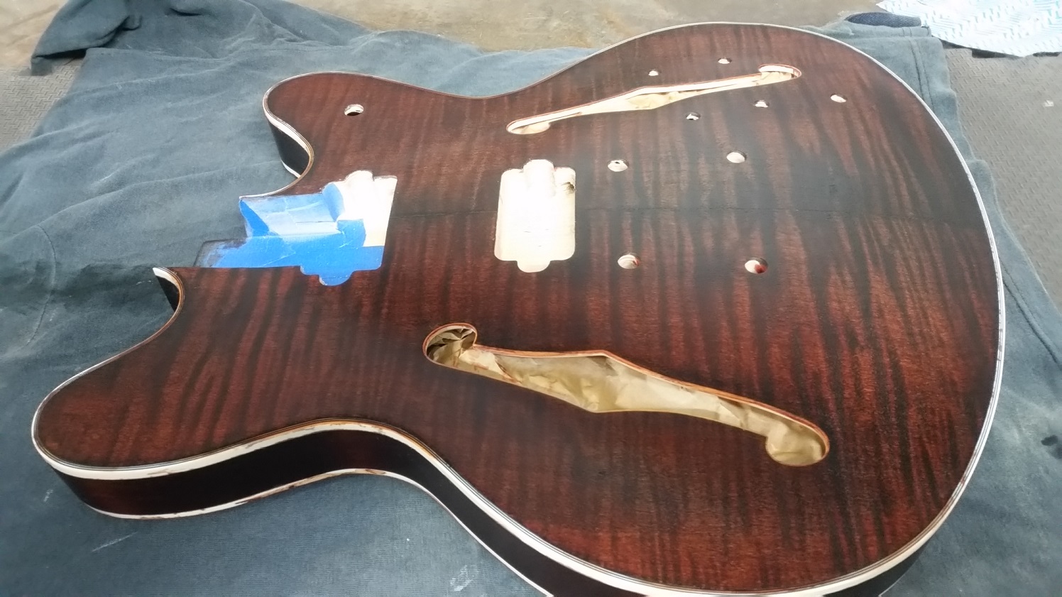 Flame top is really nice and have only found a couple of small glue spots. Speaking of glue, unfortunately some has run along the back of the body inside the bass side f-hole. Haven't tried to remove it yet, just hope it hasn't stained the timber too much. Still scratching my head as to why someone at the factory would put a pencil thru both f-holes and mark (sign?) the back of the body.