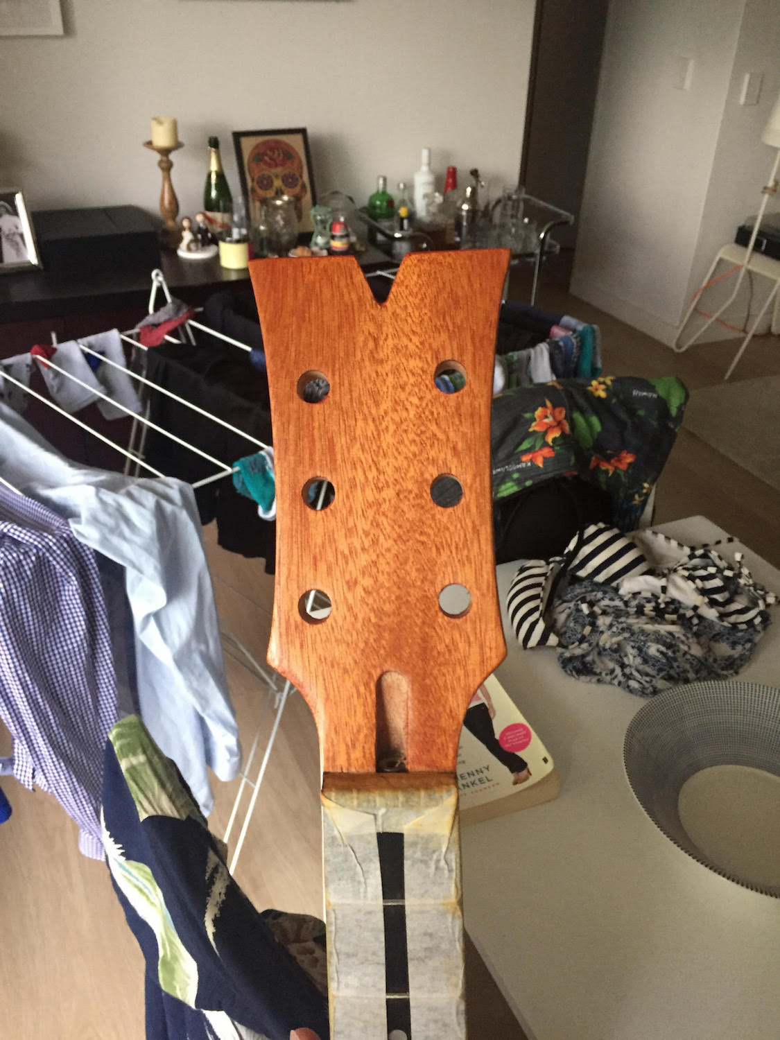 Some of the sanded body and then the first coat of the dingo stain bushfire sunset. I'm not sure I should have done the face of the headstock as I think it might impact on later paint layers (I haven't actually decided on the headstock idea yet, currently musing on some kind of paint splatter / drip thing, definitely not a Gibson style finish that's for sure.)
