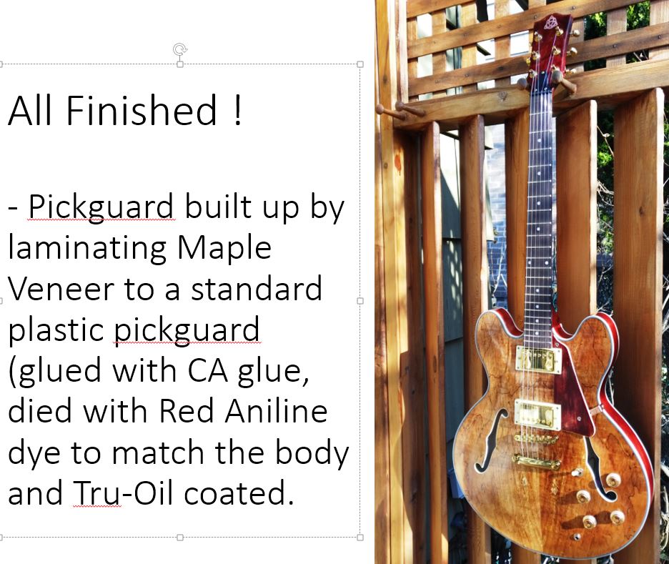 Processing on the build. After much research on options for finishing spalted maple I have elected to simply Tru-Oil the veneer on the top face. I have sourced the Tru-Oil at Lee Valley in Ontario and also found they stock Red Aniline dye that am using for the rest of the wood work (sides/back/neck). I put a few coats of Tru-Oil on the face (after masking off the sides with Fine Line tape to prevent oil bleeding through onto the sides). This protects the top from any accidental staining when I use the Red Aniline dye.