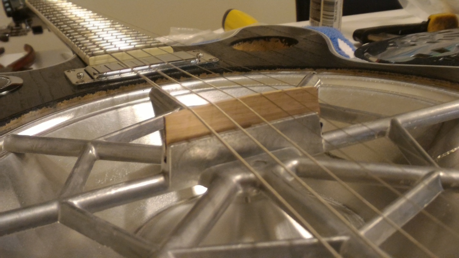 Cone and bridge - the kit bridge piece is way too small and does not provide sufficient string height and is too thin to fit snuggly in the slot. I ordered a new maple / ebony one from Stewmac but made one out of Tassie Oak in the meantime. The action is a little high but good for slide and I can fit and fiddle this one to what I want and then make the Stewmac one the same. In the pics you can see that the cone rout is off centre about 6mm (1/4) inch to the right (closer to the binding). I was able to take some of this out when fine fitting the neck but still keeping a snug pocket. The rest was taken up by allowing the bridge to be just off-centre as it just sits in the slot and is held by string tension. The cone is pressed aluminium and the rim needed to be gently smoothed of wrinkles and flattened but it now sits nicely in the rout with no wobbles. There are a few holes around the rim which fool you into thinking it is screwed down but, like the bridge, string tension holds it down and it will not resonate properly if screwed down. The main thing is the neck, bridge, and tailpiece are all dead inline and the strings locate perfectly down the neck.