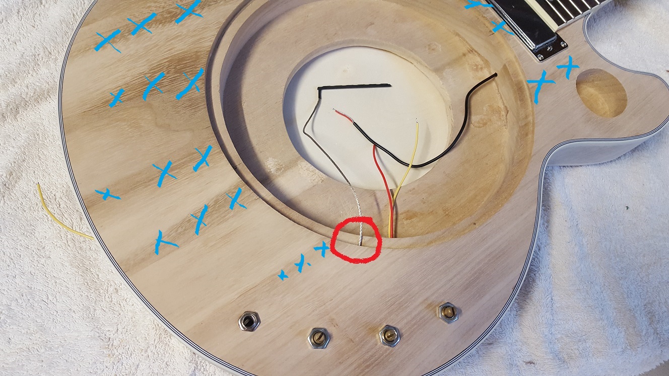I drilled a hole through the spider (red arrow) to allow the piezo to sit correctly. Purchased an inexpensive female jack to accept the supplied piezo connector and plugged it in within the pot cavity. Did the same for the humbucker but plugs together under the cone. I can now upgrade the piezo and humbucker without soldering. A friend planned this wiring and it works well. I upgraded my pots and made new all new wire.