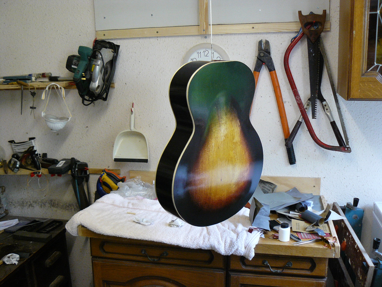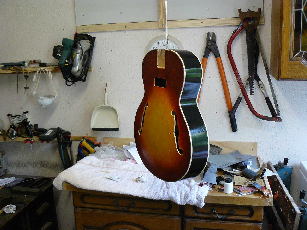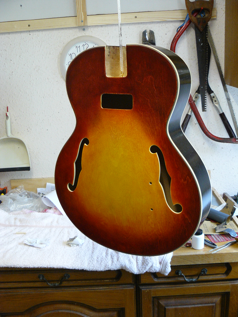 Still not totally decided on the finish; the coward inside me leans towards natural, or slightly stained, but then a good old vintage sunburst would also be so in keeping. It will be hand rubbed whatever and, if I do go for the sunburst, may use small “tester” bottles of water stain, which should give a decent range of colours without too much expense or wastage.