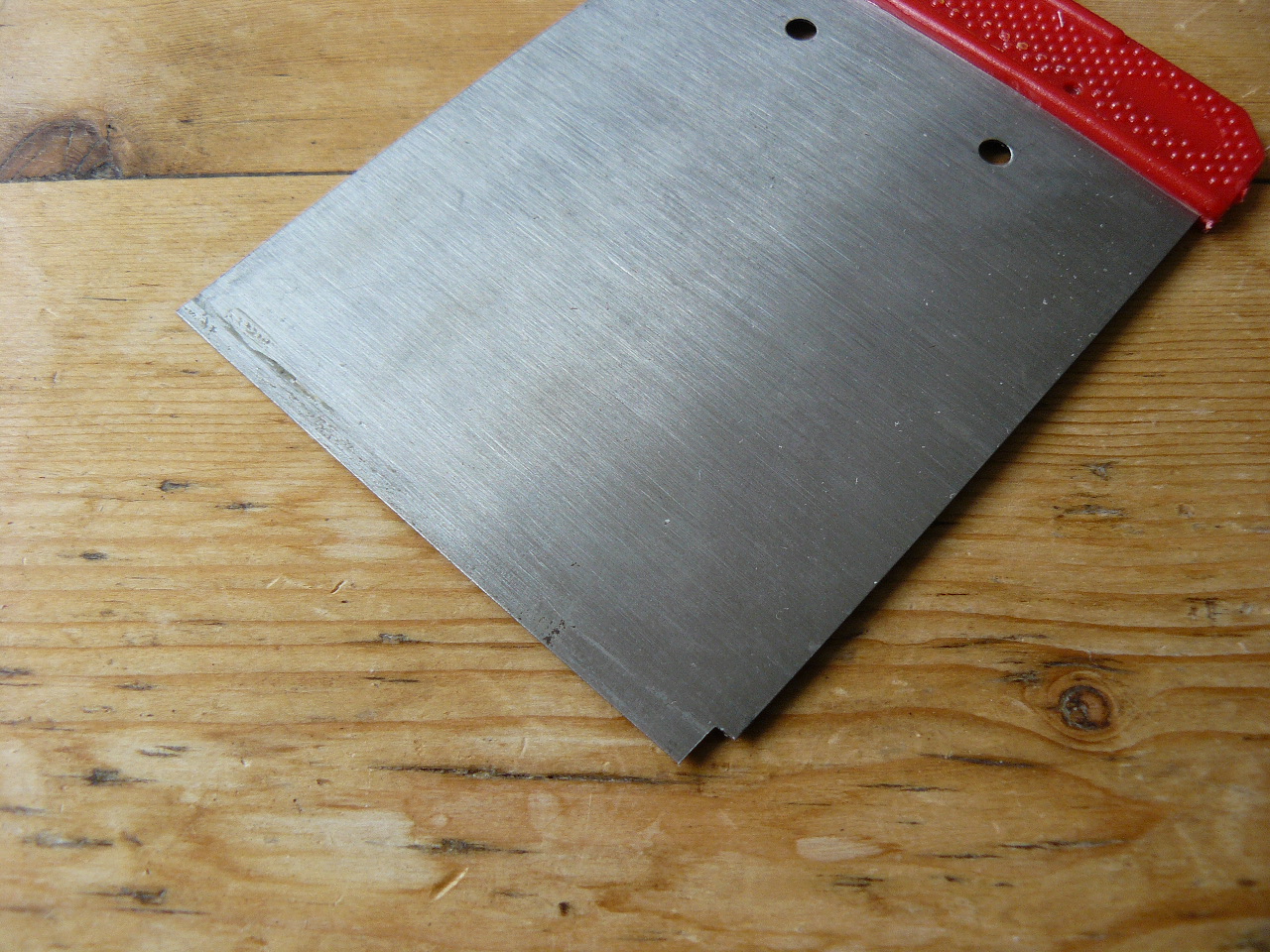 This is the scaper I used. I cut a 5mm section out of an old paint scraper - the result allows any stain to be easily removed from the plastic binding without touching the finish to the wood.