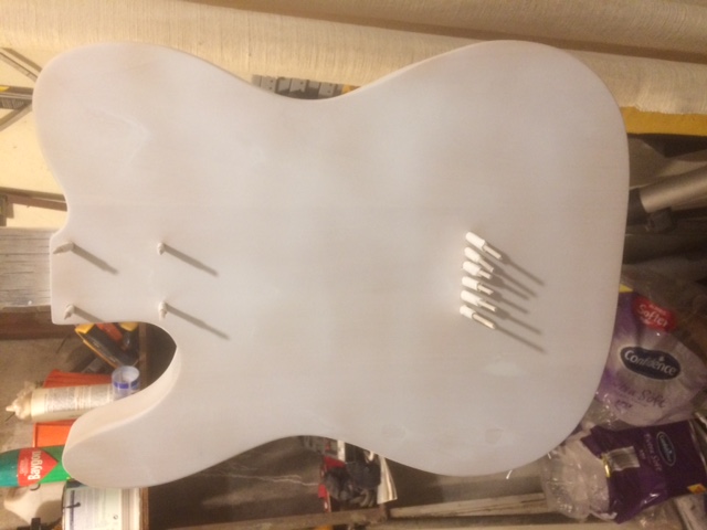 Getting there - body primed - had forgotten I was going to paint the headstock so it needs a couple more coats