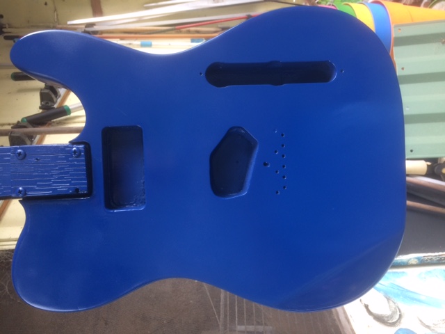 Masked it up - know how to do this now. Hit it with the blue then immediately the red glitter. Strange things began to happen - realised there was an incompatibility between the Dulux Blue and Rust-Oleum Red Glitter. Then remembered that when i painted it originally I had allowed a break of an hour or so. However I like this as an effect The crazing effect is over the headstock and shows up more clearly in shots at different angles and lighting.