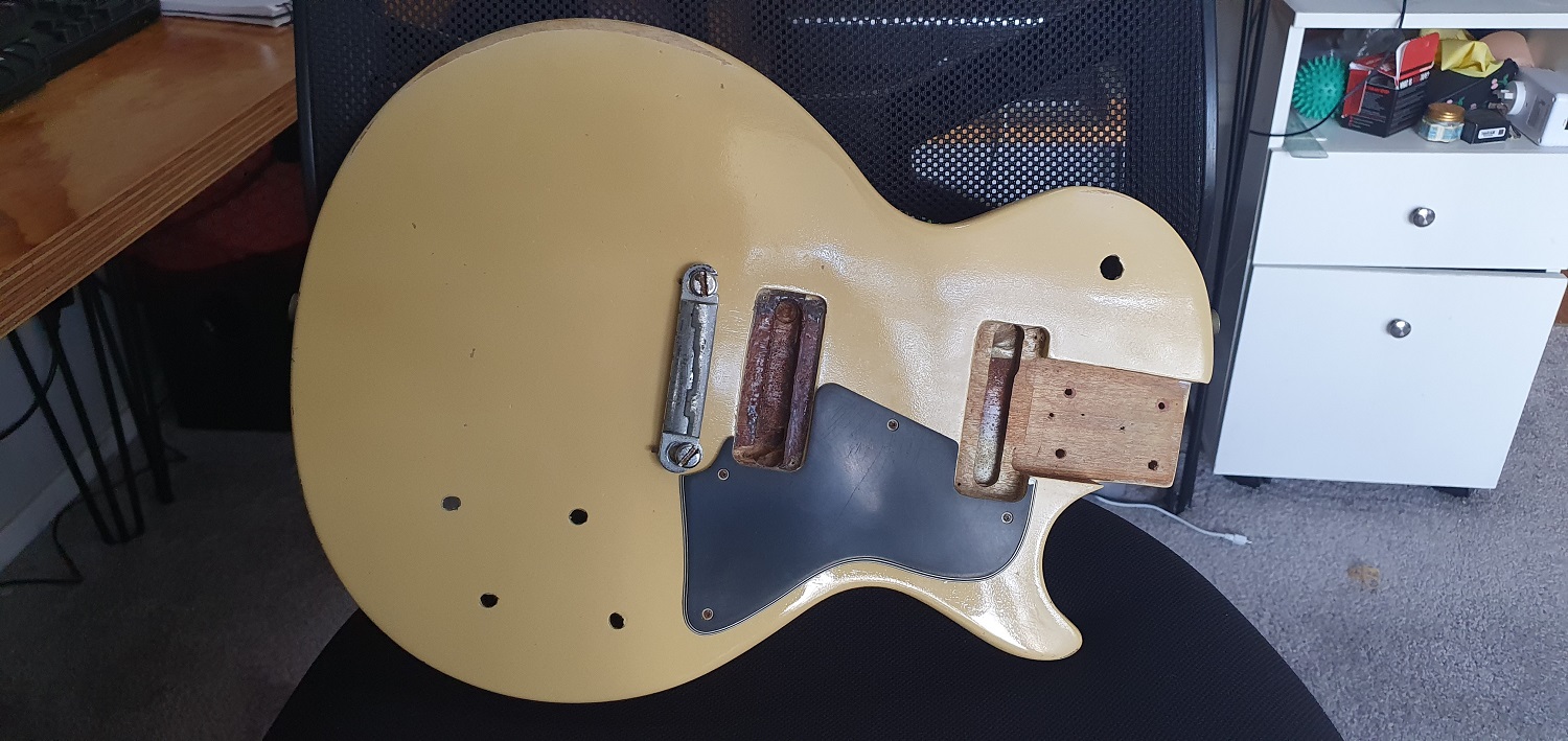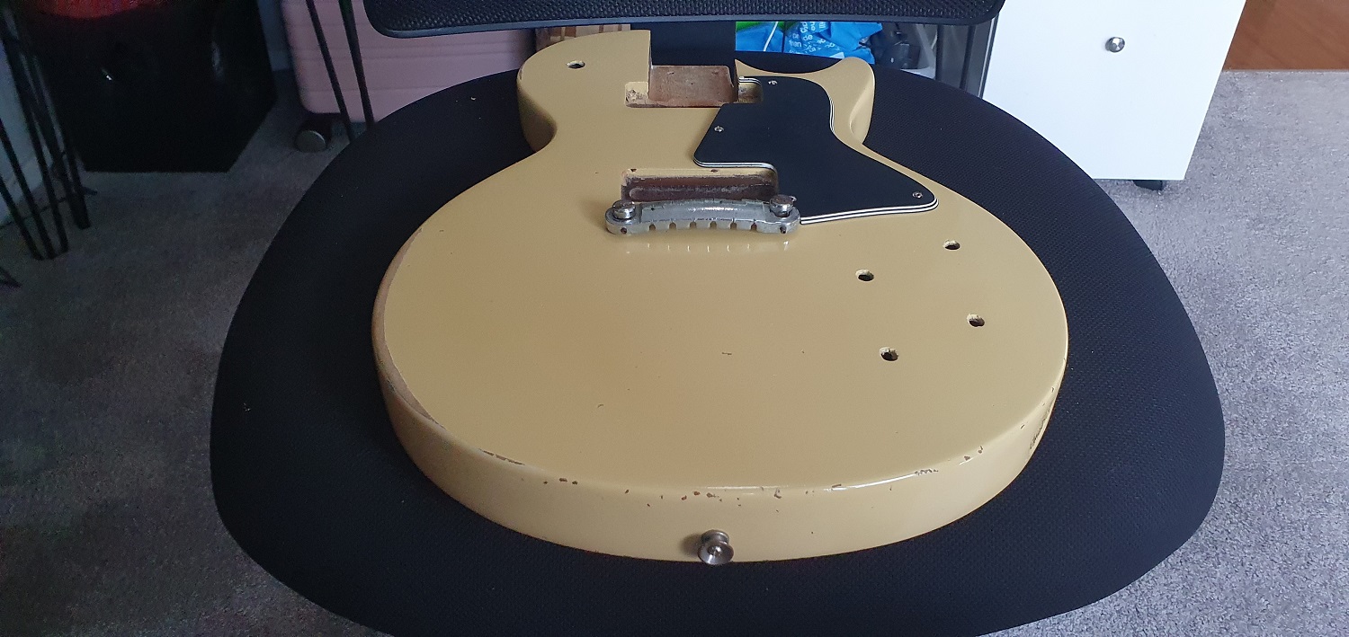 Facebook market can be an interesting place. For the princely sum of $20, just picked up a Early 70.s Pre-Lawsuit, judging by the shape of the head stock, Les Paul Special copy. Body with attached neck and plastics, no electronics. Put some pics up later.