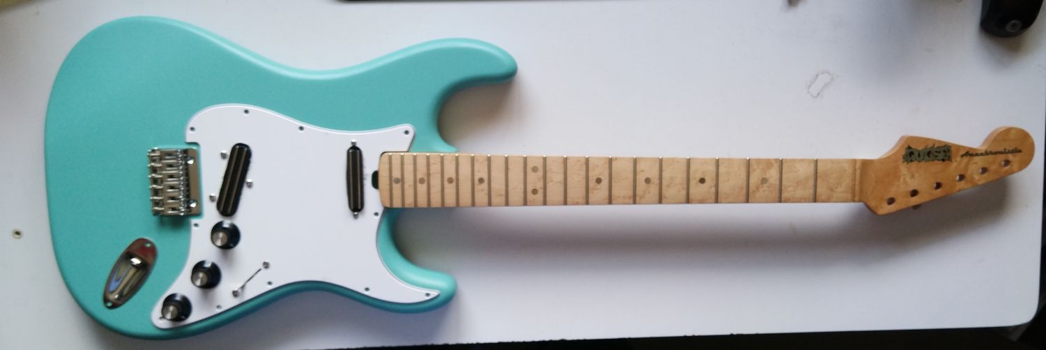 While putting off finishing my Fender-neck-on-Gibson-body bass project, I have been acquiring parts to build a hard tail Strat-ish guitar. I began so long ago that I can't actually remember when it began. The closest that I can get is that shortly after I got the neck and the body, I purchased a 1960's vintage Eko case for it from Angela Instruments to put it in. I must have gotten the neck and body around that time. I still have the sales receipt for the case, so that dates it to early 1987. I put some finish on the neck to preserve it, as Warmoth told me to, so that began the build...