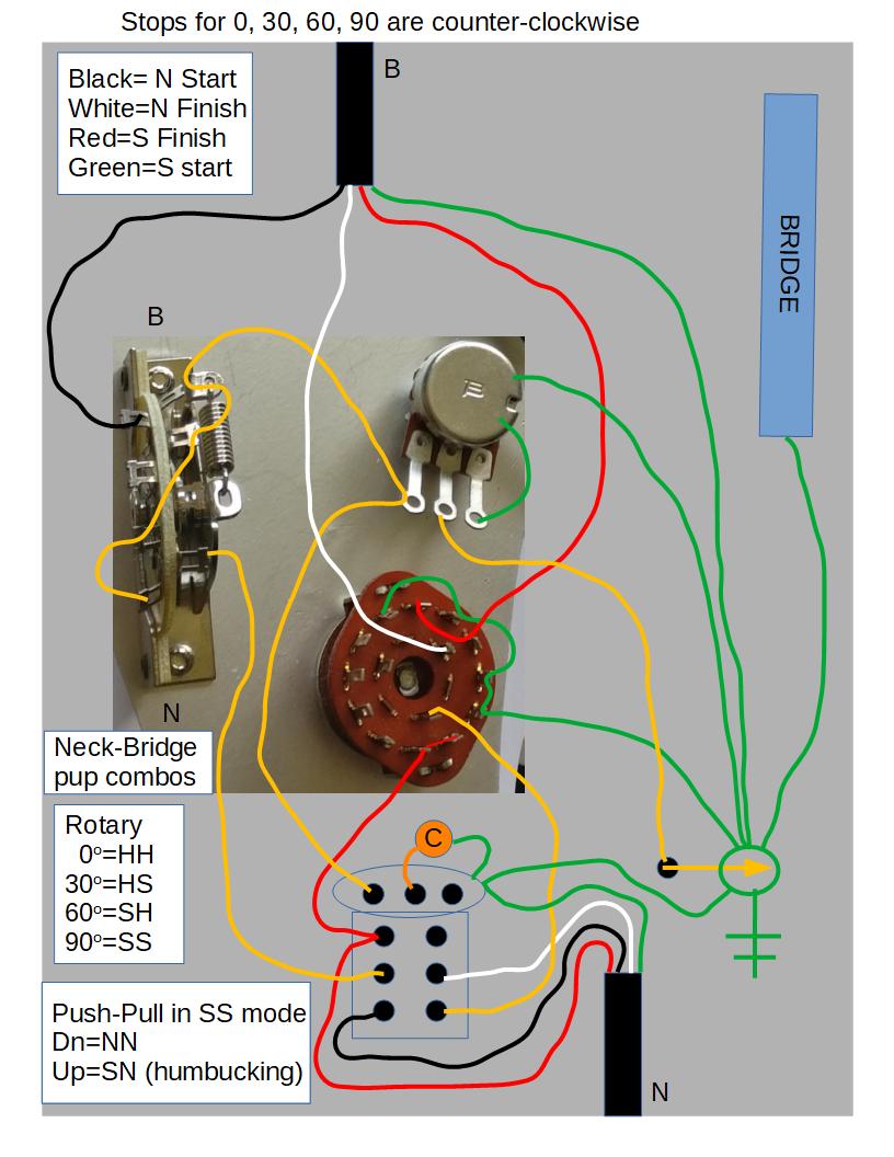 The rotary switch will switch humbucking and single coil modes. HH, HS, SH and SS. The SS setting from the switch is traditional Tele, so it is not humbucking because it uses the north coil of both pickups. The push-pull switches from the north to the south coil on one of the pickups to make the SS setting humbucking. Probably more trouble than it's worth...but thank you to WeirdBits for helping me to map it out.