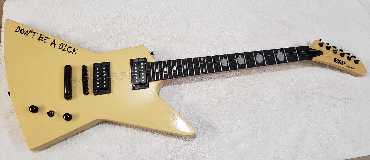 He wanted to do a copy of Hetfield's "Eet Fuk" guitar, and when Mom put her foot down against that logo we found a compromise with her and decided on a 'tribute' version with a different slogan. We are pretty proud of what we've accomplished so far.