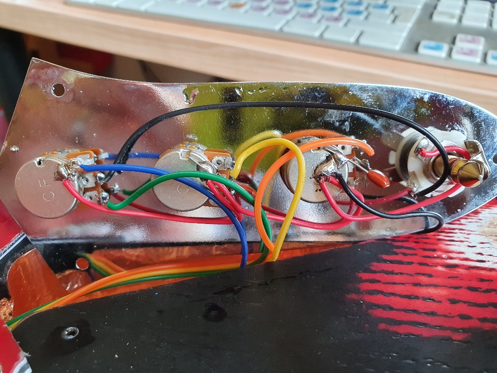 When I first took the control plate out of the box, the blue ground wire came off almost instantly. I re-soldered this to the top of the volume pot, I think this was correct. I also think I've got the blue ground wire soldered to the selector switch in the correct place.