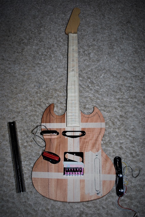 New project at mock up stage is a hybrid SG/Tele. I have always liked SG's and Telecasters and this is the first 6 string I am attempting to build. The reach to the higher frets looks to be a little compromised due to the mismatched body shape and neck attachment, but that is something I may be able to address at the shaping stage. The pick ups are not finalised yet, but will probably go for both hot rails although I am tempted to put a P90 in the neck position. Switching will be simple telecaster 3 position. I am looking to stain the neck and body with beetroot juice for a natural red before finishing with Danish oil. the overall length is just 37 inches so nice and compact with a 25.5 in. scale. The maple fretboard has been treated with pharmaceutical mineral oil then masked to let it soak. All my components at this time are budget units but seem to be adequate to my needs. Due to the current lockdown, my workshop and power tools are not readily available so it may take some time to get going, will report in due course.
