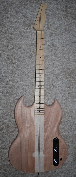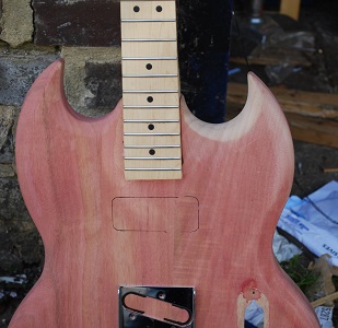 Well the neck is fitted, Hand tools only, drill, depth gauge, chisel, mallet and sandpaper. Its a nice snug fit and fairly pleased with it. Initial shaping/profiling with rasp, files and sandpaper and again I am fairly ok with it. I have decided to go for a rounded profile rather than flats and to be economic with the removal to retain mass. I have decided to leave the back end slab shaped so its a bit like a tele with a soft shaped SG in the middle. The grain is looking like it might be nice too. I strung some thread through the centre two string slots to check my centre line and temporarily tied to a small screw where the strap button will go. This is simply to confirm my positioning of the neck, so at least in one plane at the moment we are ok. I cut out the control panel slot and jack socket hole (maybe mis-measured where that should be, but I will live with it) So a slow start (maybe not a bad thing, no router jump!) more sanding and possibly deepening the lower cut-out a touch, but I don't want to lose too much of the SG shape. My daughter has renamed it the Sergeant (Sgt.)