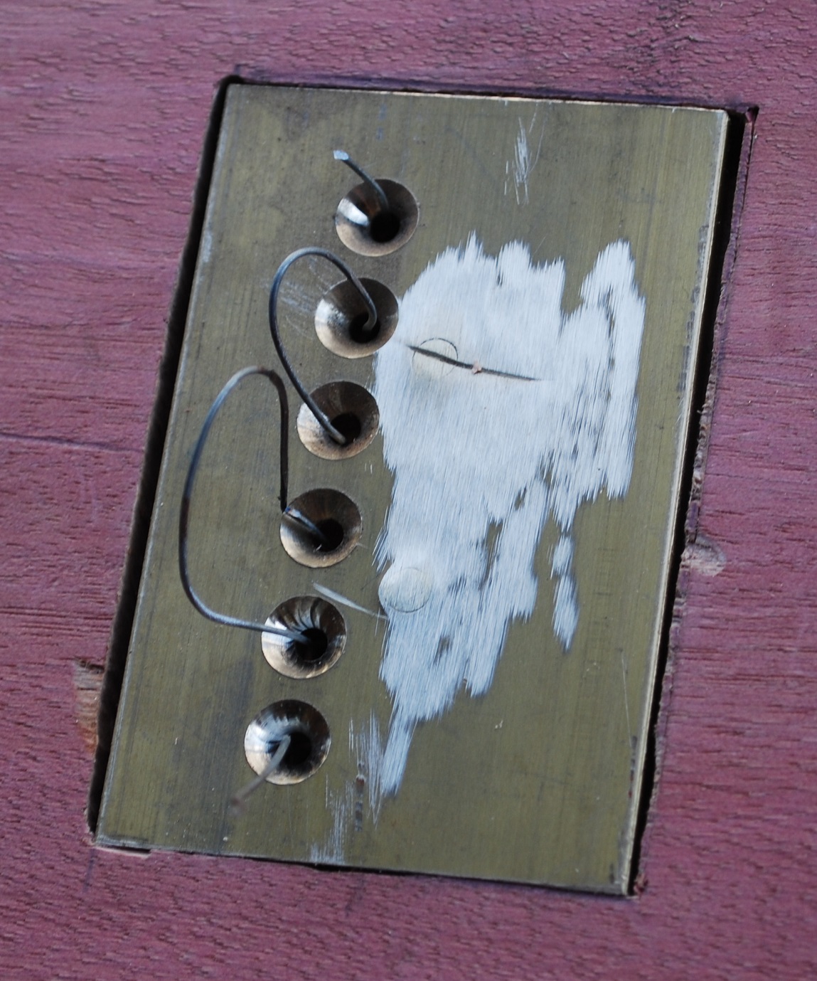 I worked out a way to cut the rebates by using my Dremel and a spiral saw after knocking up some simple 6mm templates. In some ways it is better than a router as it can be as slow as you wish and it doesn't try to leap out or rip the wood. After going around the outline, I criss-crossed with the tool and then removed the waste with a chisel. I drilled wiring holes from the neck pocket through to the bridge pickup and from the bridge pickup to the control panel. the centre hole in the bridge plate is for a ground post. I drilled the string through holes and lined up my sustain block, a 6mm lump of brass, then drilled the string ferrule holes and 2 mounting holes which I tapped M5. I assembled the bridge/block using brass wood screws on the outer and M5 brass machine screws on the inner holes, which lock the bridge and block together. In the pictures I used baling wire to represent strings. Unfortunately when cutting the screws to length I nicked the block with the cutting disc(doh!) (that'll buff out, I told myself!)