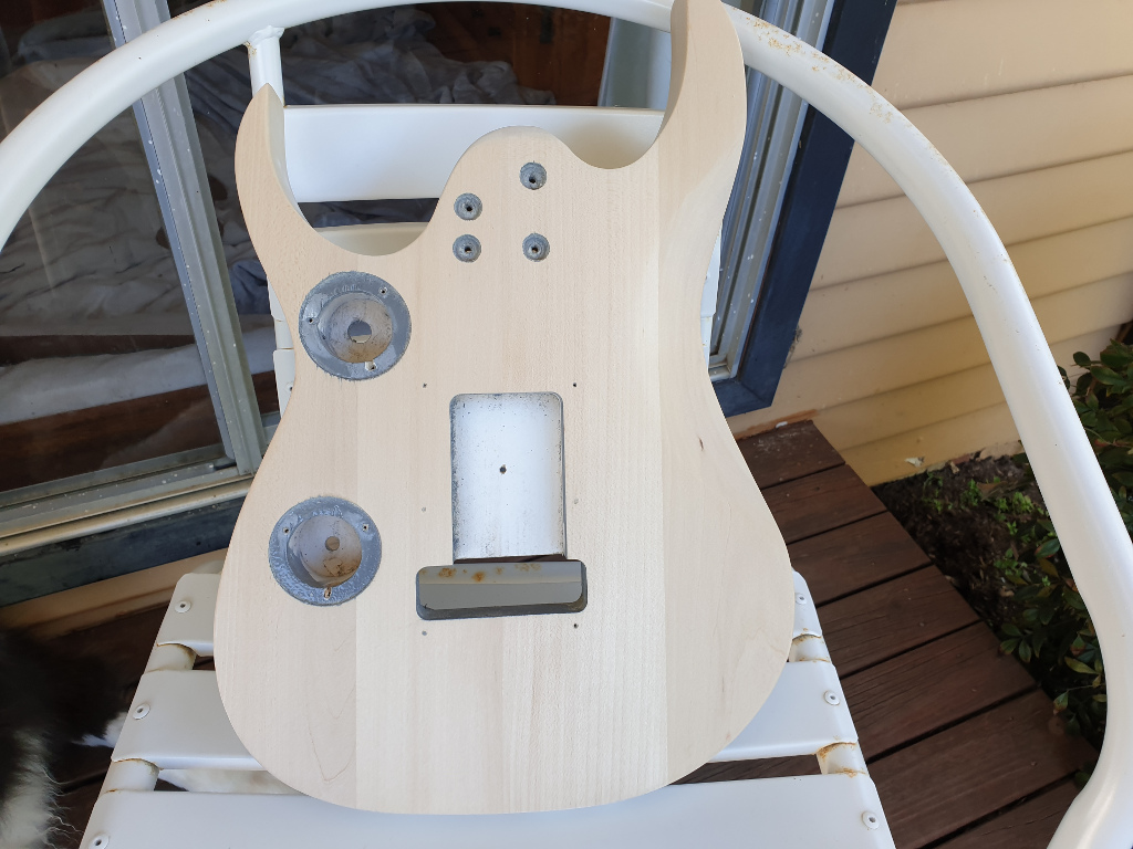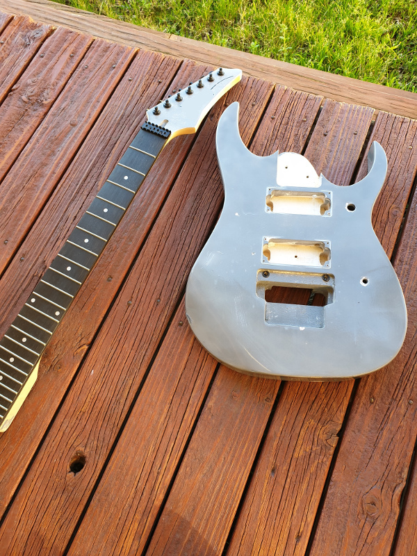 I originally built this not long after seeing Satch play in Sydney and wanted to build a chrome-look IB type guitar. I originally used a Dulux Duramax metallic silver spray which looked kinda cool but finger prints were a real problem - they got on easy and were really difficult to wipe off. So, I thought I'd try a gloss clear over the top but it completely ruined the metallic silver effect and just made it a dull grey. Rookie mistake - always test on scrap wood.