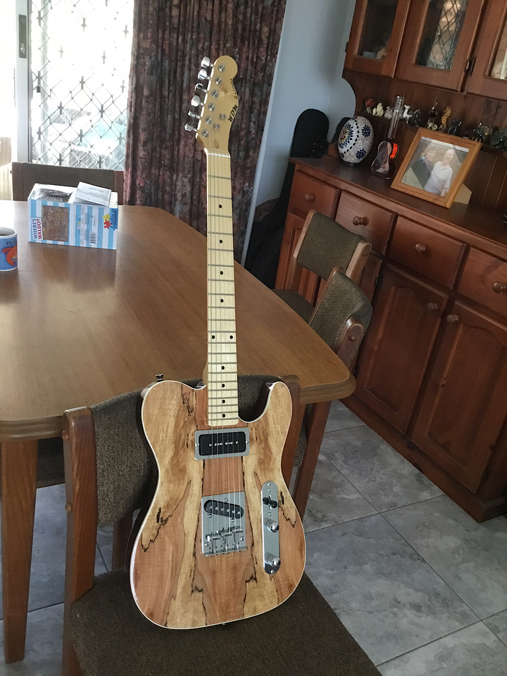 Hi all, here’s my TL-1S, mahogany body with spalted maple top. I didn’t use the pick guard so I could see more of that spalted maple goodness. That left an opening for a bigger pick-up so I went with a Tone-rider Hot90. I didn’t like the look of the open rout with the pick-up just popping out, so I made my own pick-up ring and had it chromed. That turned out well as it matches the rest of the hardware perfectly.
