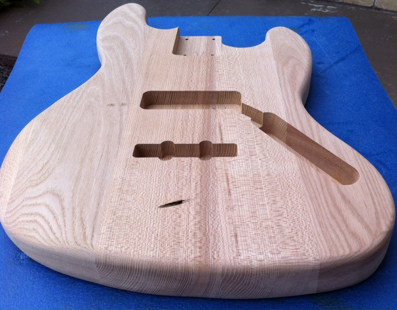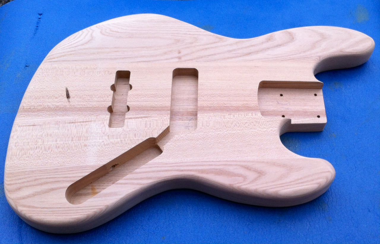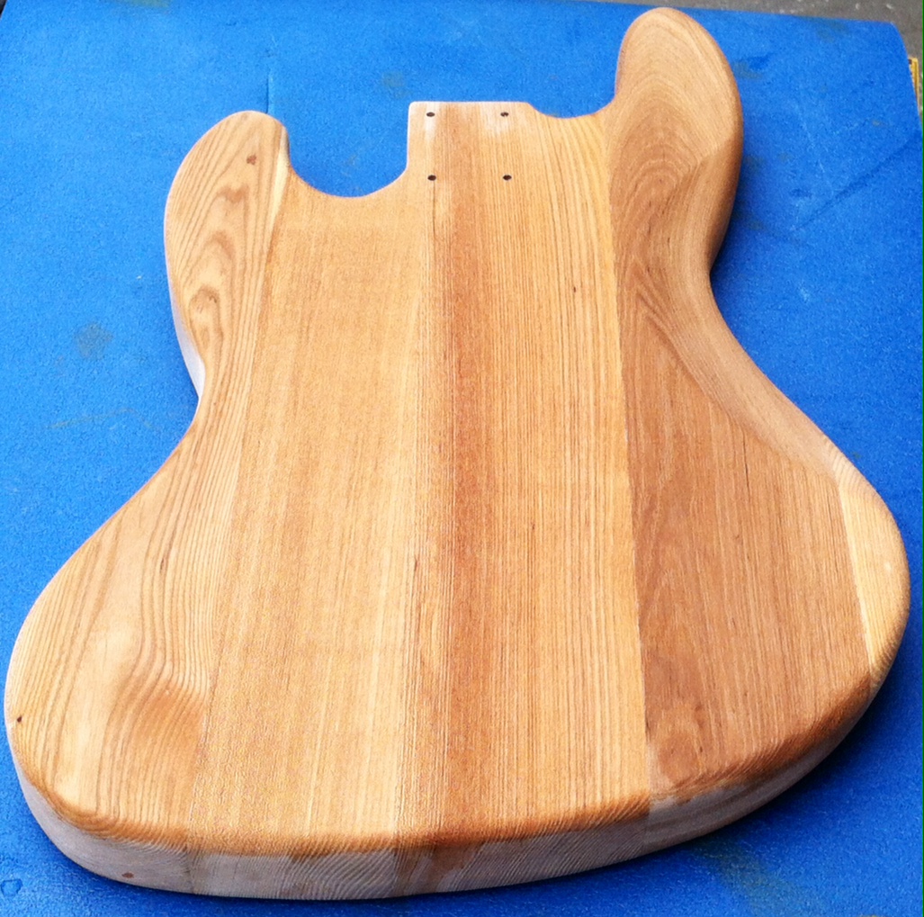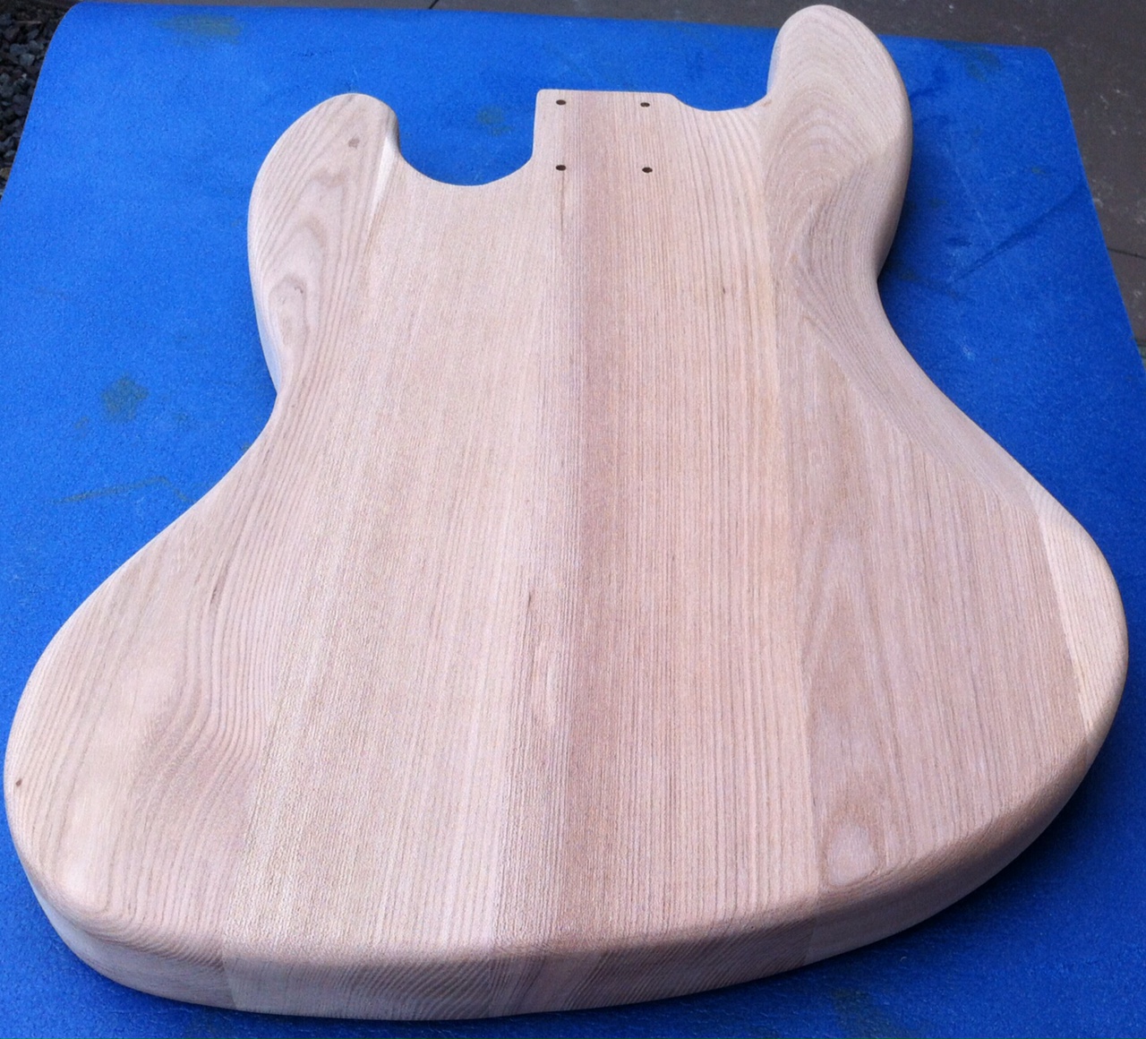 Yep, officially a sucker for punishment as this will be my 4th build when I haven't even finished 1st or 2nd and just starting a 3rd as well. GAS has surely gotta hold of me. Had to help clear some of the DIY closing down stock and was always eyeing off doing an Ash J Bass at some stage. Have longed for a Candy Apple Red with white pick guard and Maple Fret Board for ages however as this has so much awesome grain there is no way that will be hidden by a solid colour. Trying to figure out which way to go to get that toffee apple translucent red over the slightly pinkish darker Ash might be the challenge and any suggestions would be appreciated. At this stage I have looked at many different ideas from Color Tone Cherry Red and maybe mixing that with some Color Tone Mahogany? Maybe Feast & Watson Cedar mixed with their Mahogany and watered down with Metho? Looked into leather dyes and stumbled across Jacquard fabric dyes that could work too. Saw Keda dyes on Ebay and not too sure if I want to go down that path. Having used DT for 1st & 2nd builds believe Karajini Red might be the closet to Cherry Red but not convinced that is the product I want to use on this occasion. Also bought some humble food colouring at the supermarket last night and still tempted to find the darkest ink pad ink to play around with too. Looking forward to any feedback as this will be a slow burner whilst looking to find the exact colour to show off all this grainy goodness. Did buy some ebony timber mate from the BGSFOS and apologise profusely hoping that Woks has a pint waiting for me when I have been extradited to the Naughty Warehouse. Some dry and wet photos below where there is only one blemish around curve of top horn down to neck pocket. Most of these kits have at least one of these issues to deal with and a shame their QC standards a so low.