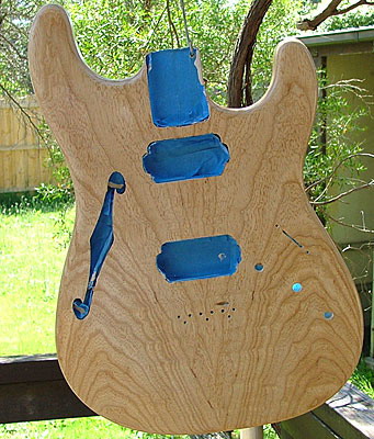 A day after the coat of Timbermate neautral filler i spend a bit of time sanding everything back with 220 grit, time consuming and gives you Popeye arms. After the sanding i ran over the body with the brush head of a vacuum cleaner then wiped the whole guitar with naptha. A second sealer coat was then applied, i went a bit thicker and made sure i got everthing.