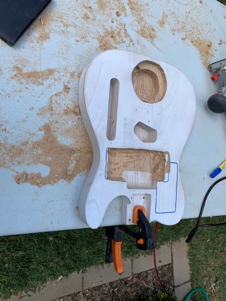 Routing out the body, the speakers give about 4mm thickness of wood left. There's one in the back too as the PX is stereo.