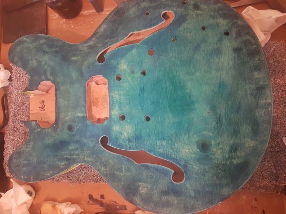 Sanded the body with 240 grit, and attempted a blueburst on the ply top.As you can see, I used three different colour blue dyes.