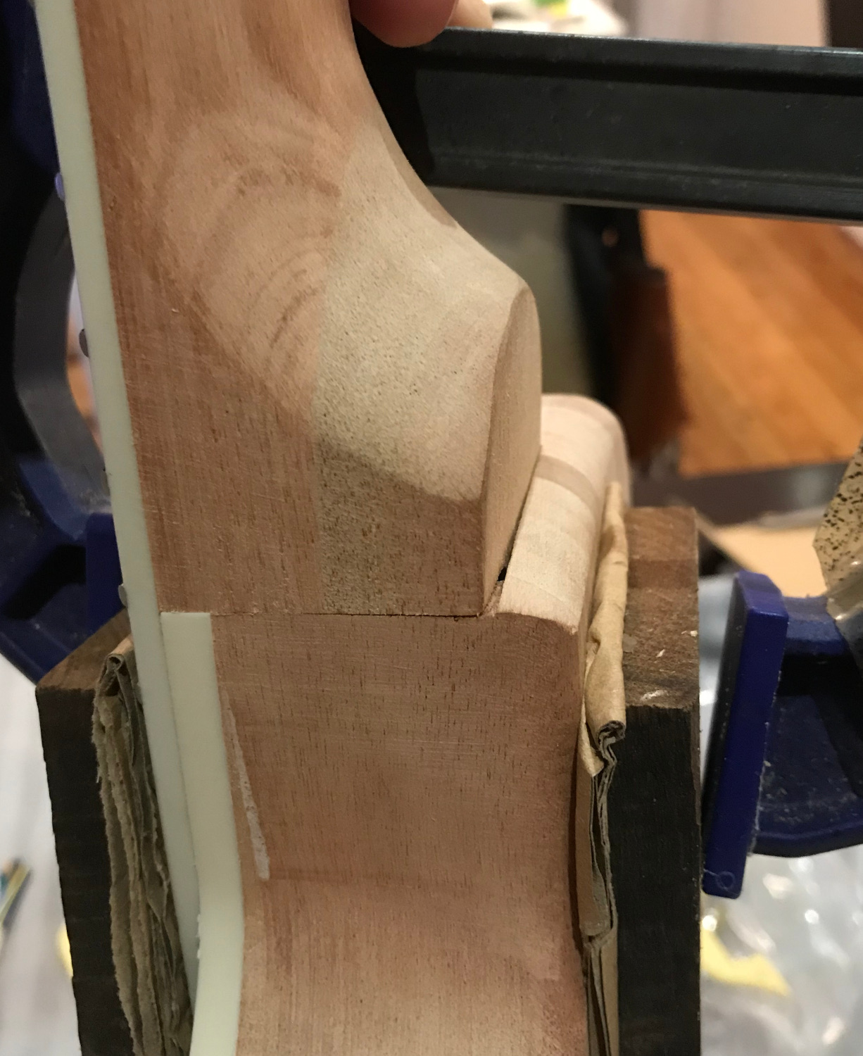 I would appreciate some advice on the neck. It's a snug fit, but I'm not sure that it's seating into the pocket properly, i.e. I'm not sure there's a lot of contact between the heel and the floor of the pocket. Here are a few photos. Even when clamped quite firmly, there's a gap between the neck and the pocket, and a slight gap between the board and the top of the body. How would you tackle it?