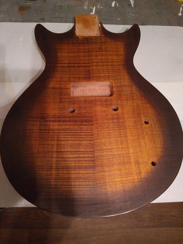 Unfortunately I only have a couple of pictures of the build in its current state. My phone bit the dust over the weekend, and at some point the SD card had filled up and all pictures were going to internal memory, so they're gone. Below is what I have so far. I wanted to experiment this time with highlighting the flamed maple with black stain as the base. It's certainly not perfect, but I've learned a lot for the next time I want to attempt this.
