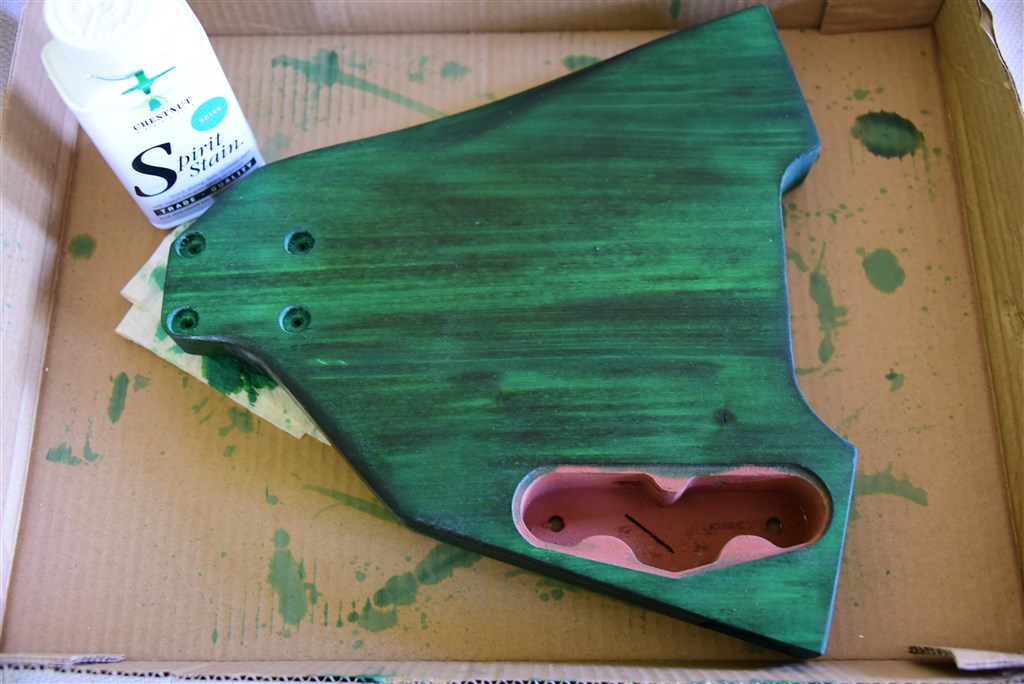 The add the colour. I'm using Chestnut's green Spirit Stain, it took a few coats to get the depth of colour I want. Then a very gentle flat with 600 grade paper (just to get rid of the suicidal flies that arrived...) before a very light blow over with clear varnish (again from Chestnut). I did this because I'd tried various approaches on some of the off-cuts generated in the re-shaping and I found that trying to get a "mirror smooth" wood surface without a coat of varnish meant I lost the depth of colour, and using a sanding sealer before putting the stain on led to the stain "skidding off".