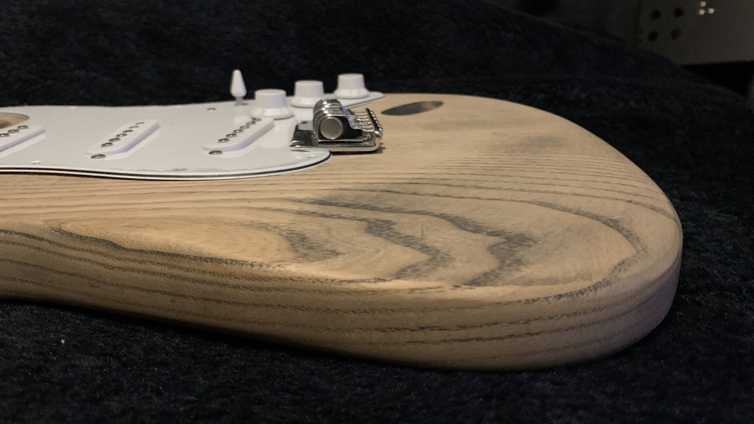 It's currently sitting sanded to 240 grit. Next step is grain filler. Then I'll drill all the holes (neck, then trem, then pickguard). Here's the comfort curves after sanding: