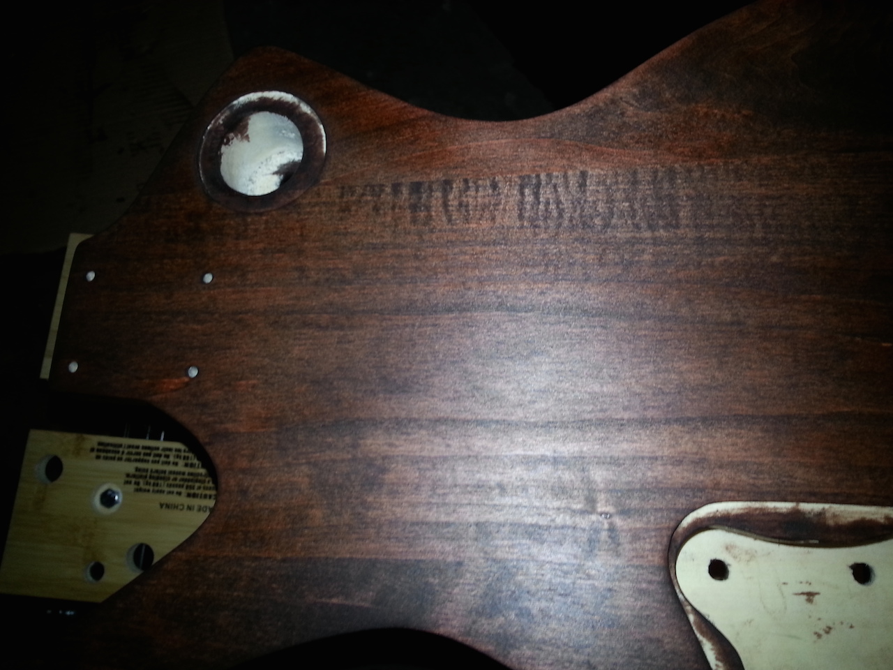 I also decided to apply it as thick as I could without leaving puddles or runs as this got me the colour I wanted. 2 hours after I applied the stain, I went to wipe off excess and there wasn't much that was wet. Wiped down neck and body. It is tacky but not wet. Will let it totally dry for a few days to ensure it's dry, but I am happy with the colour.Click image for larger version.