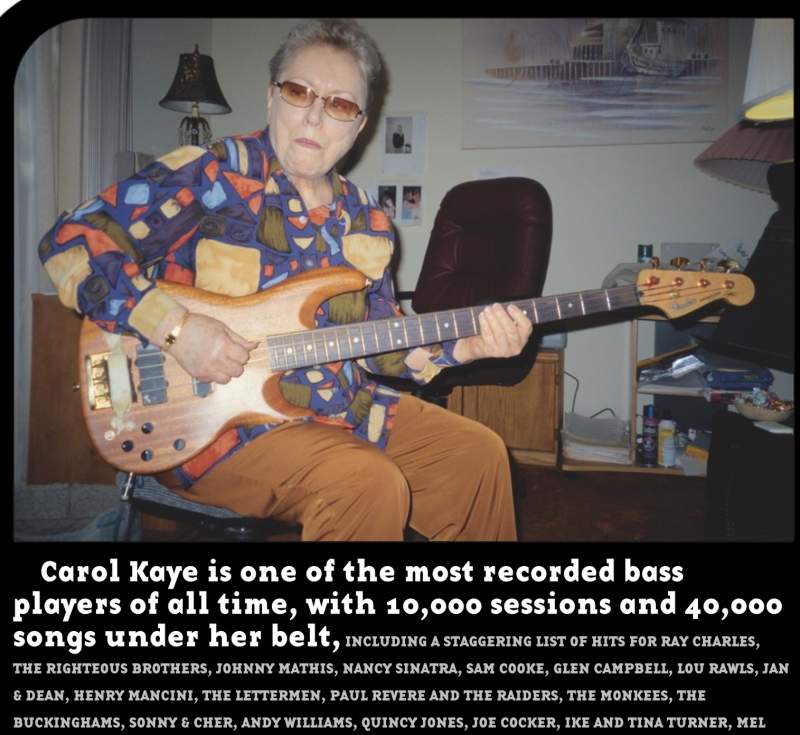Carol Kaye is one of the most recorded bass players of all time, with 10,000 sessions and 40,000 songs under her belt, INCLUDING A STAGGERING LIST OF HITS FOR RAY CHARLES, THE RIGHTEOUS BROTHERS, JOHNNY MATHIS, NANCY SINATRA, SAM COOKE, GLEN CAMPBELL, LOU RAWLS, JAN & DEAN, HENRY MANCINI, THE LETTERMEN, PAUL REVERE AND THE RAIDERS, THE MONKEES, THE BUCKINGHAMS, SONNY & CHER, ANDY WILLIAMS, QUINCY JONES, JOE COCKER, IKE AND TINA TURNER, MEL TORME, BOBBY DARIN, FRANK ZAPPA, WAYNE NEWTON, HERB ALPERT AND EVEN SOME MOTOWN TRACKS CUT IN L.A. CAROL IS ALSO THE BASS FORCE BEHIND THE BEACH BOYS' PET SOUNDS AND SMILE RECORDS, PLUS MUCH WORK WITH PHIL SPECTOR AND HIS "WALL OF SOUND". HER LIST OF ACCOMPLISHMENTS IS AS ENDLESS AS IT IS IMPRESSIVE.