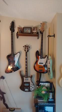 Nice collection, hard to see as the image is so small. Is that a Firebird guitar and jazz bass ? whats the surfer green axe a strat ?