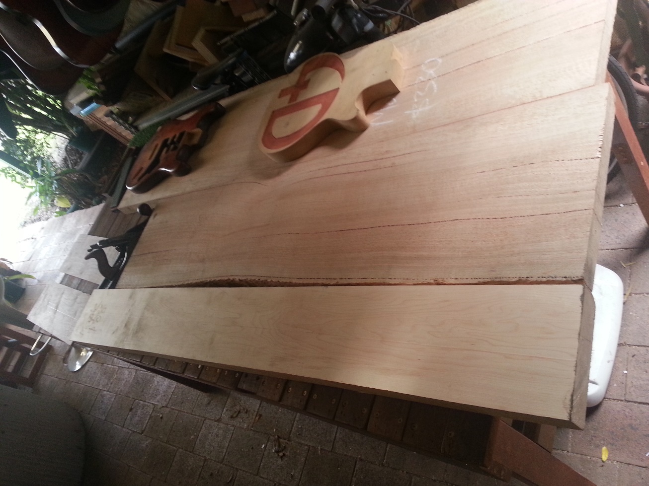 went to the Perth wood show yesterday and scored some nice timber. Scored a 3.1m long marri slab 42mm thick (two wider chunks in 1st pic) and a nice rock maple chunk (left in pic) will make 4 necks.