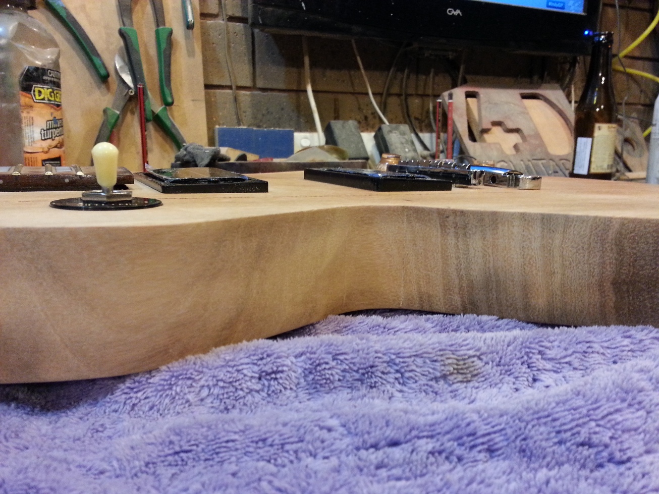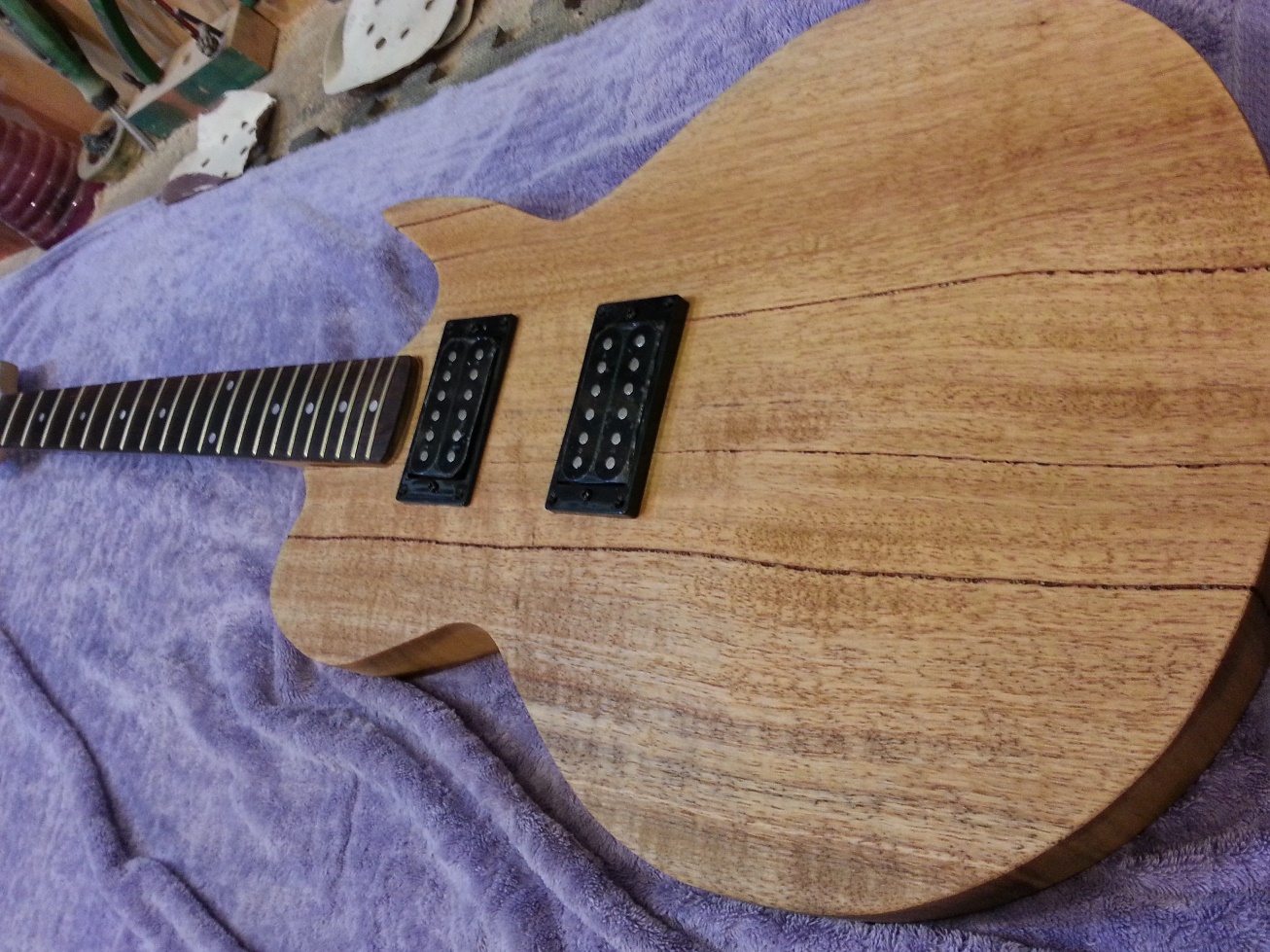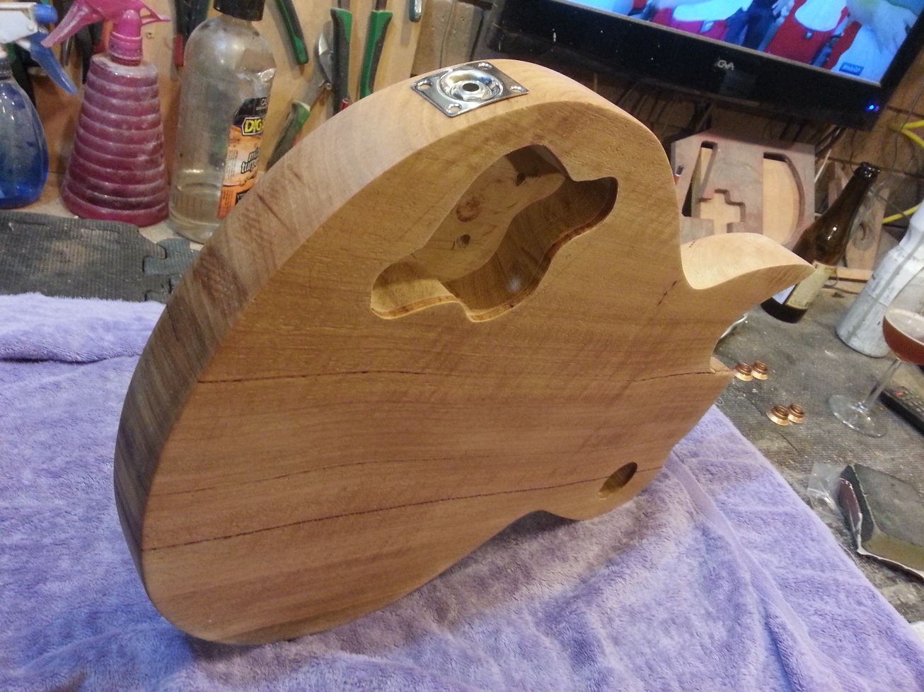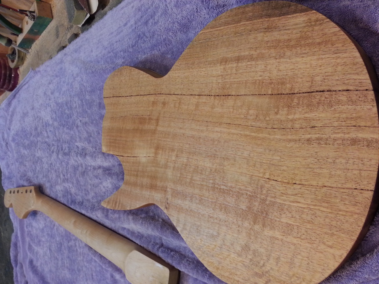 Never built a LP shape so wanted it a bit different put a small tele-ish dip above the neck and made the horn longer. Still need to do some sanding and reshaping. Got the neck and pup cavities routed and a rough sand. Will probably attempt an arch top as it weighs a heap. Should get the control and switch cavities routed this arvo