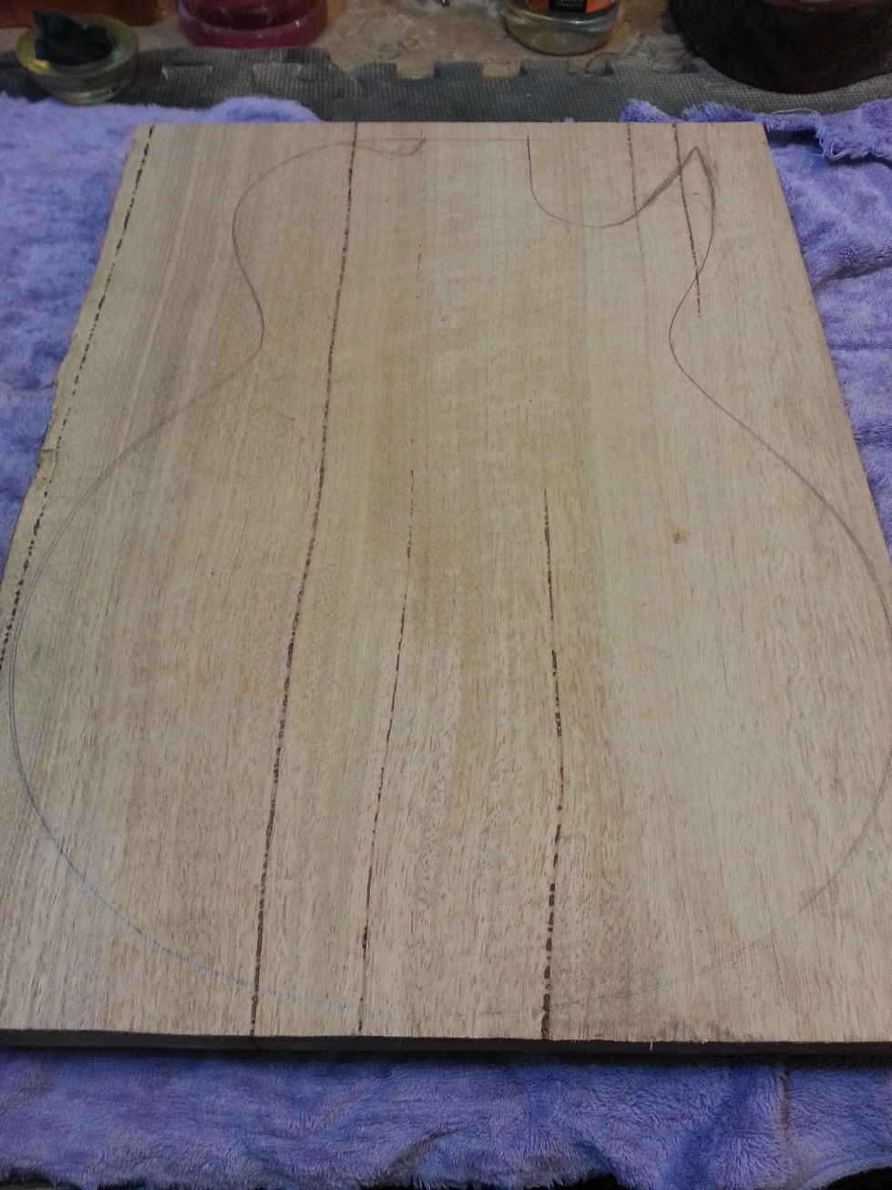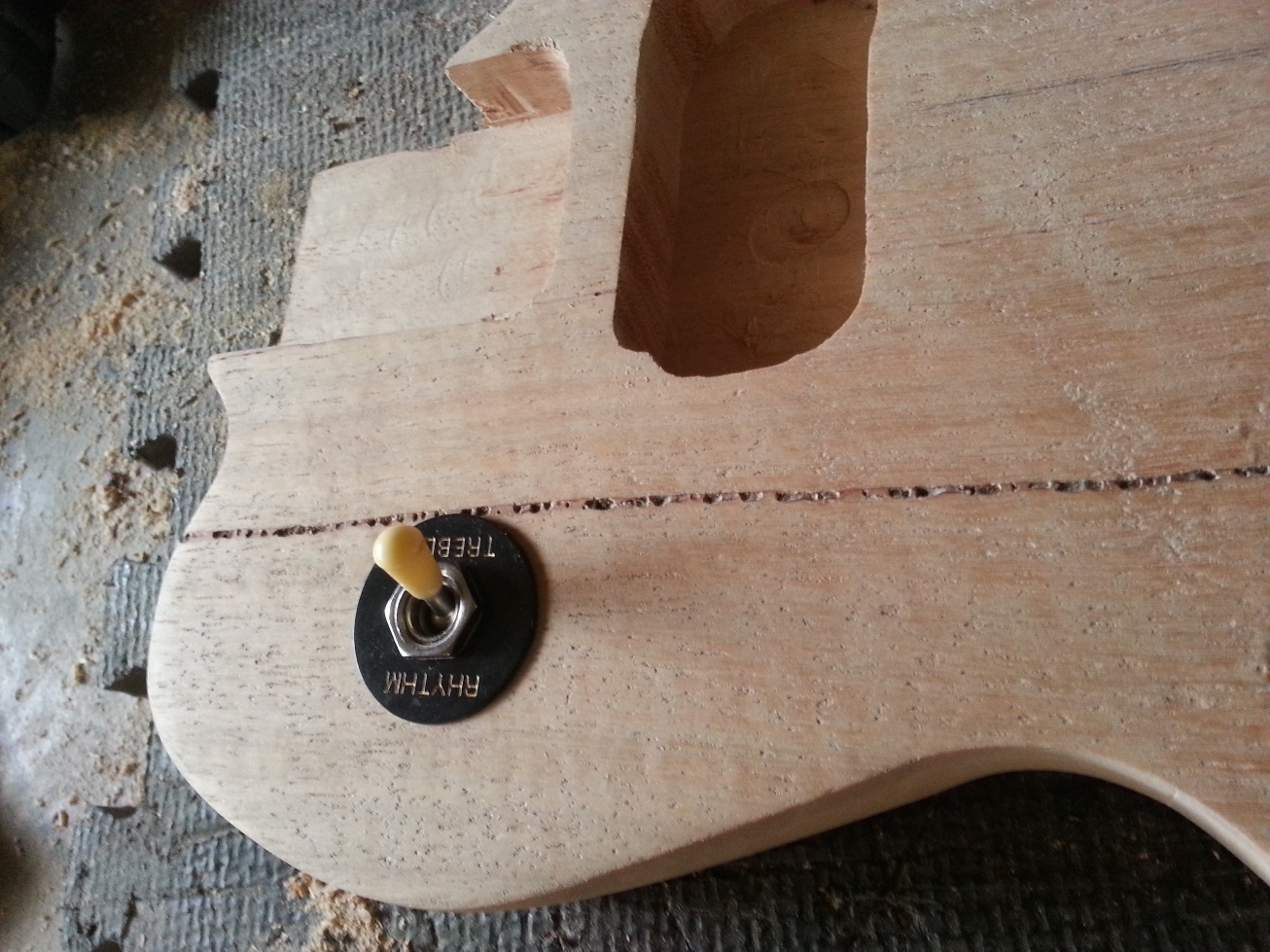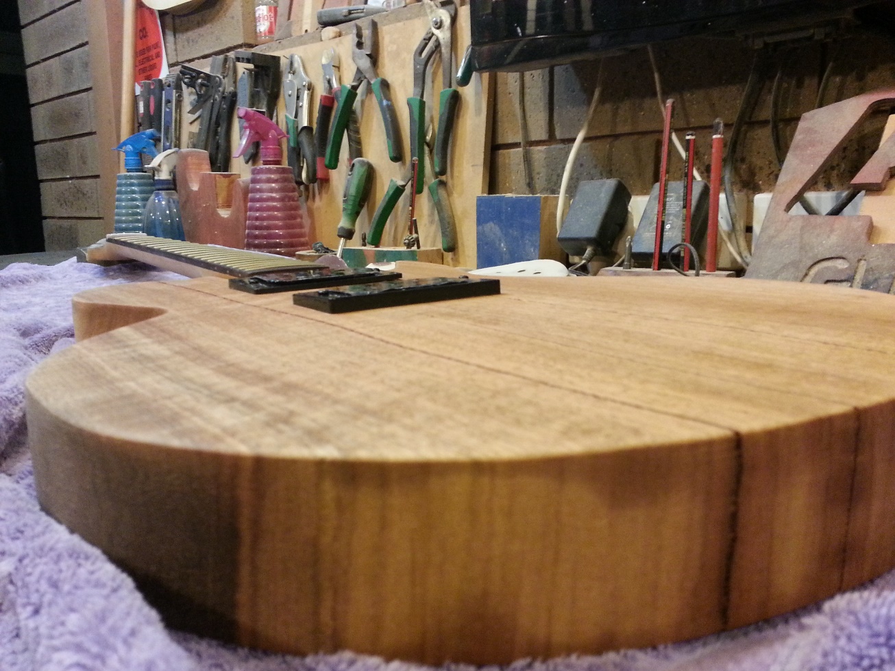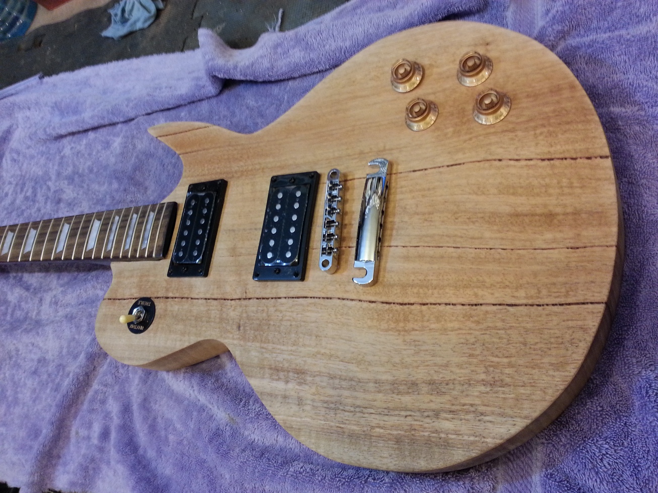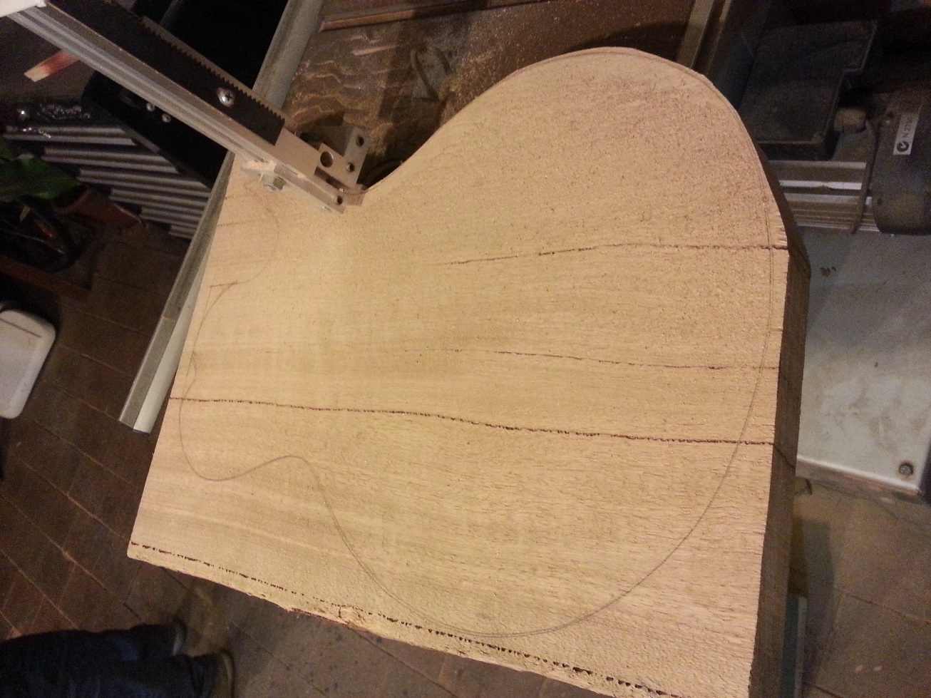 Never built a LP shape so wanted it a bit different put a small tele-ish dip above the neck and made the horn longer. Still need to do some sanding and reshaping. Got the neck and pup cavities routed and a rough sand. Will probably attempt an arch top as it weighs a heap. Should get the control and switch cavities routed this arvo