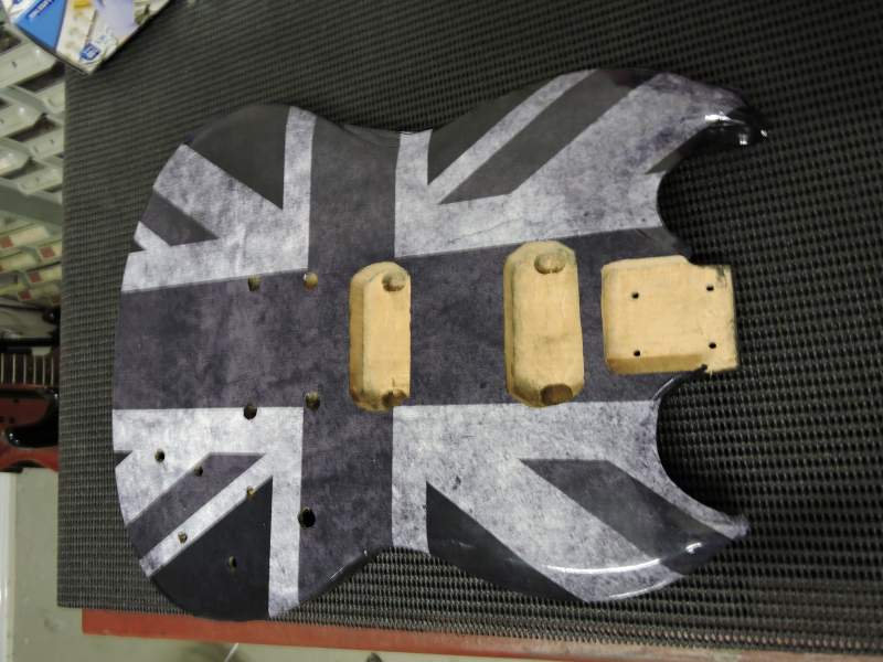 Stained the body with Jap Black F&W and slightly distressed the finish and will be covering the front and headstock with a Distressed Black union jack in Vinyl.