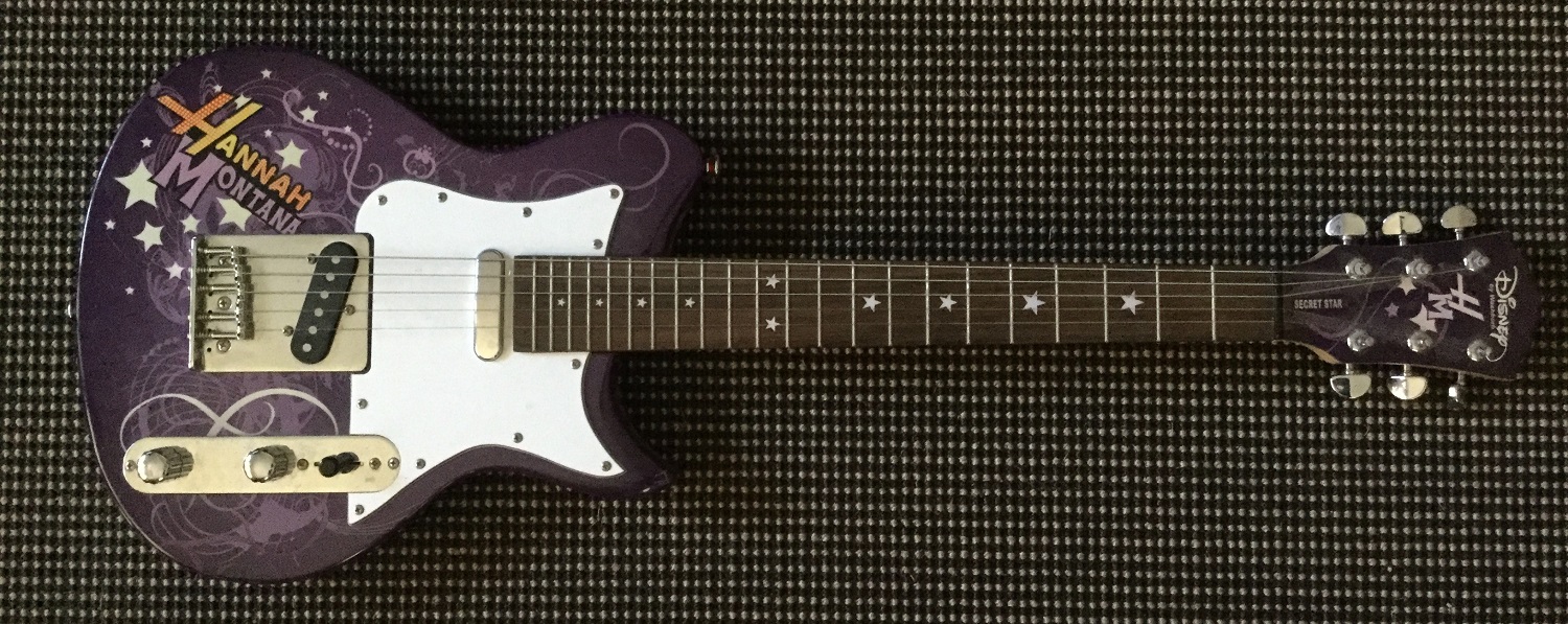 Picked this up for $30 so as my daughter is learning guitar this year, I thought, I'll give her a gift from Daddy and practice my skills. It will be so much fun sanding off the Hannah thing too. I have some old pickups and other stuff to install. I've ordered a new bridge and knobs, so it's down to the body business.