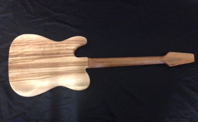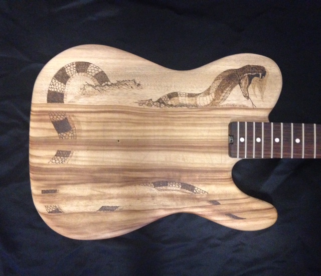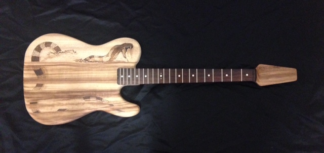 This is a scratch built "Tele" body contoured in Cypress Pine with a pyrographic snake. The neck is Tassie Blackwood with a Rosewood fretboard and clay dot markers and a sort of snakehead headstock shape.