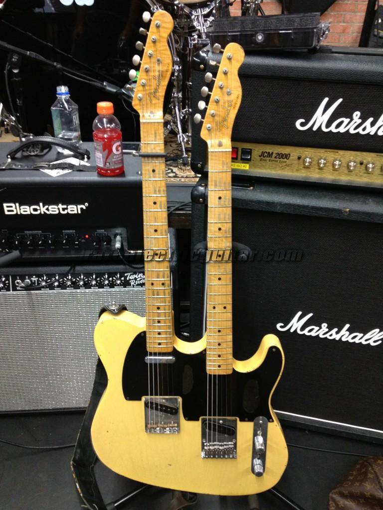 Looks like a Babicz bridge on the lower guitar, standard Tele bridge on the top. Judging by the neck wear (unless its a reliced job), the top one gets far most use Maybe the bottom is set up for slide? Possibly the single pickup is a result of trying to keep the switching system simple.