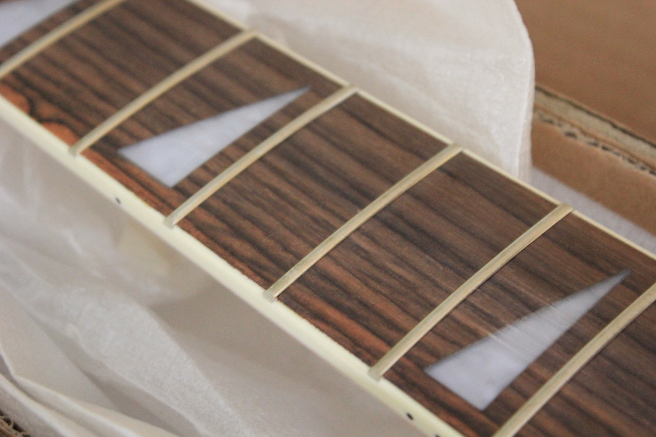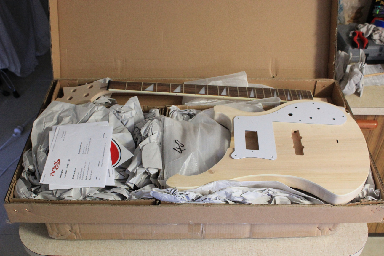 The kit arrived in great shape. There's a couple of glue marks on the front face but they'll be covered by white + splatter anyway. I don't even have to sand them out! All the routing looks perfect, the neck is nice and straight, and the grain on the fretboard looks amazing. Very happy with the quality yet again from Adam & co. Thanks guys!