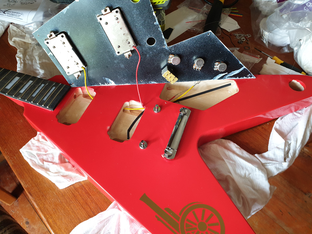 Never done one like this before with all the pickups and knobs mounted on the pickguard but still needing to route the wiring through drill holes in the body. Makes for a very awkward soldering job because I need to balance the pickguard near the body while doing all the soldering so I don't have a crapload of cable to bundle back into the cavities. As much as I hate the idea, might be worth doing this with plug-in connectors so I can solder it all and route cables through, then just connect the plugs just before I mount the pick-guard.