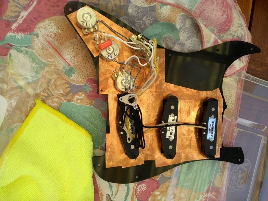 I used the copper tape to shield the pick guard, screwed everything in, carefully soldered everything (pre bend the ends of your wires into little hooks before you tin them, then using the 'extra-hands' you can lock them onto whatever it is you are fixing them too and have free hands for the solder and iron).