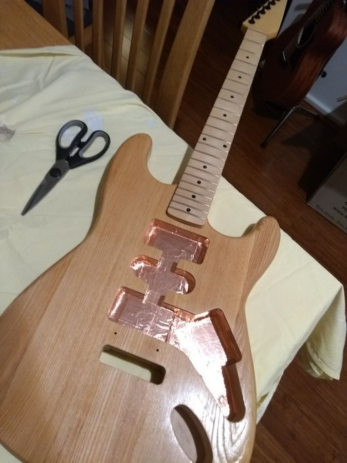 Before fixing the pick guard i shielded the cavity with te rest of the copper tape. I could probably have done with maybe 15 extra cm of tape!